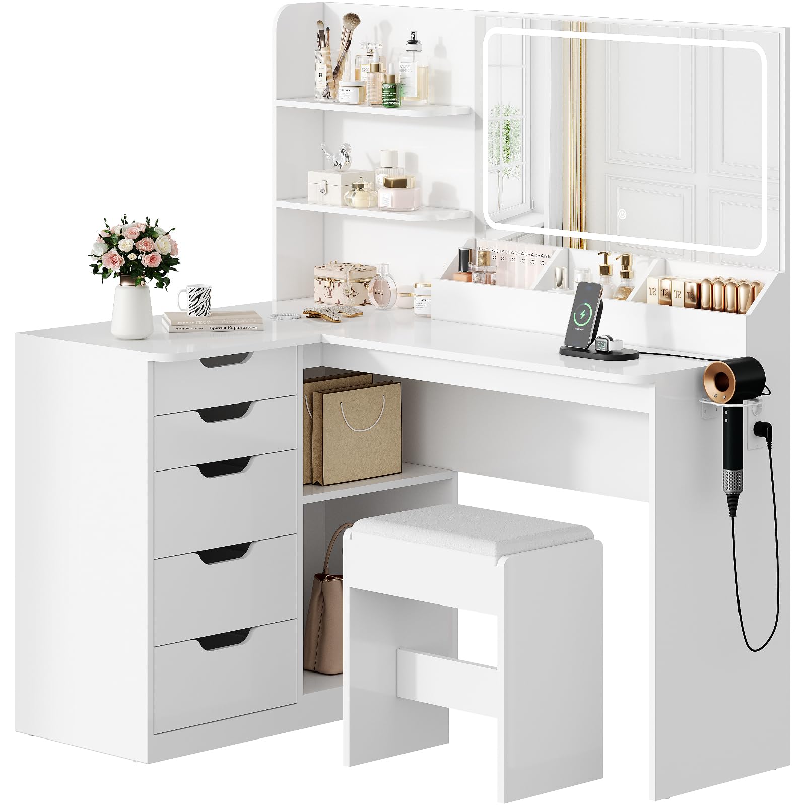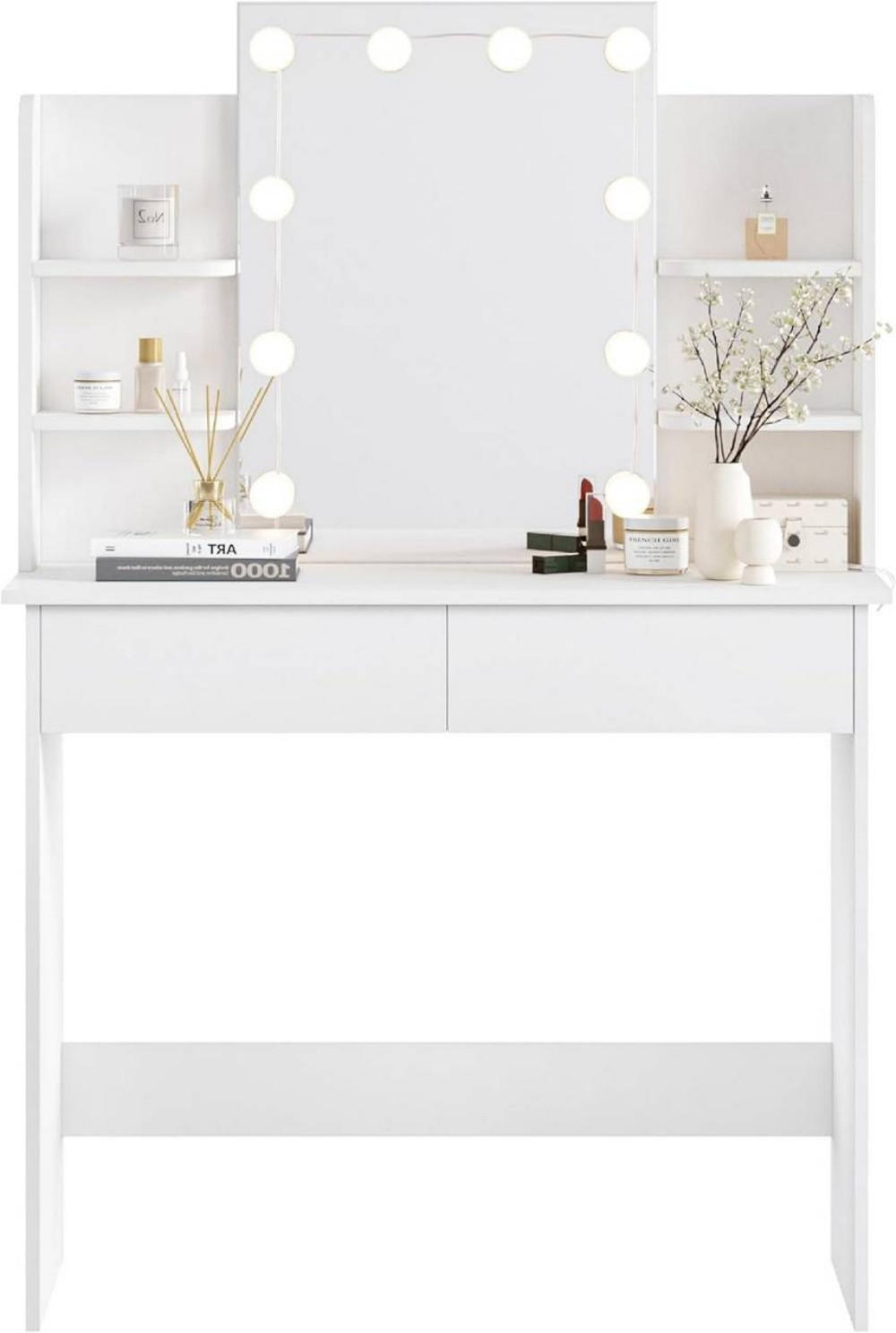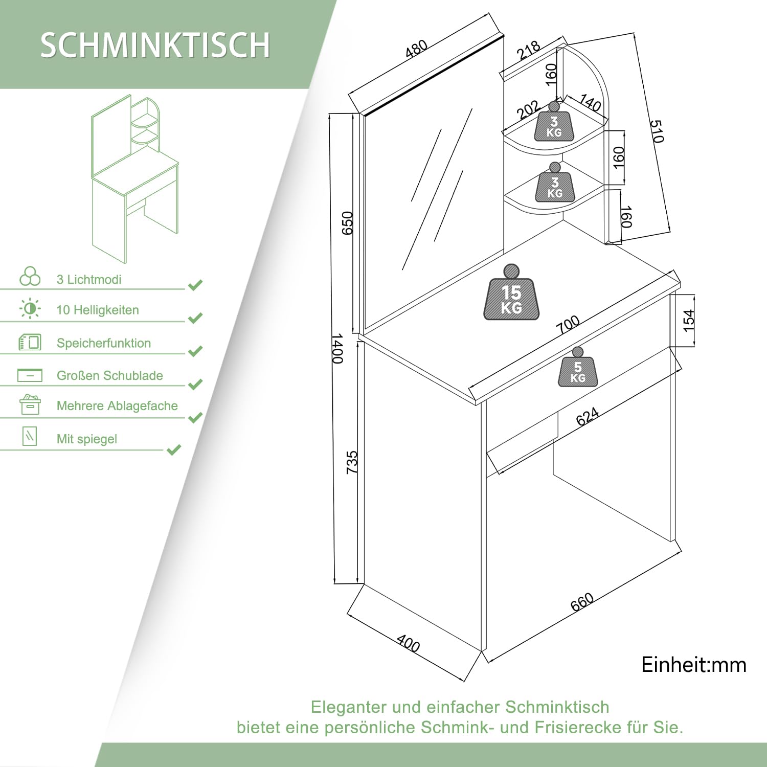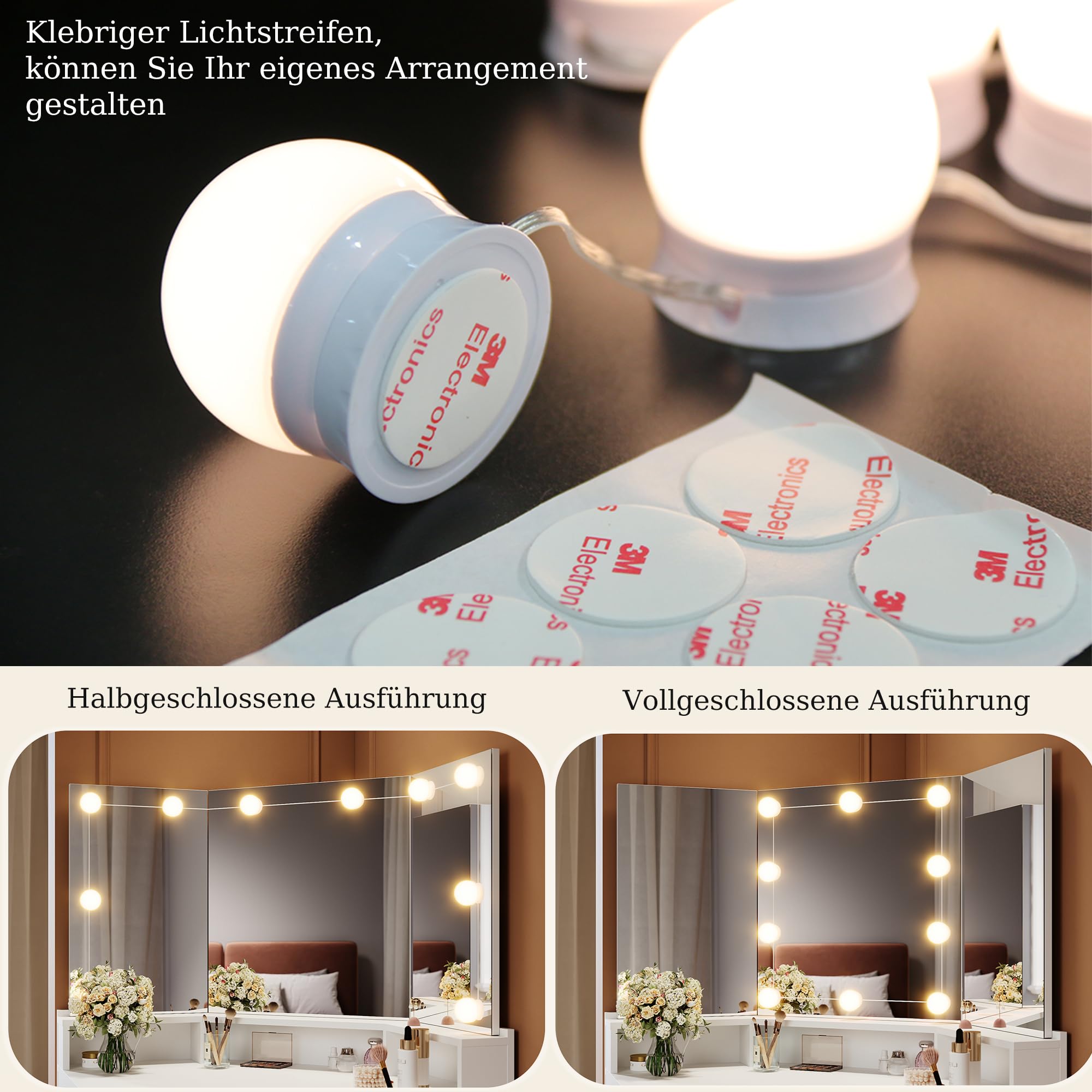 Träumst du von deinem eigenen Beauty-Bereich? Dieser SUNXURY Eck-Schminktisch macht's möglich! Mit 110x54x141,5 cm passt er perfekt in jede Zimmerecke. Das Highlight: Der dreiteilige Spiegel (mittel 52,9x55,5 cm, seitlich 34,2x55,5 cm) zeigt dich aus jedem Winkel. Die LED-Beleuchtung mit 3 Farbtemperaturen und verstellbarer Helligkeit sorgt für perfektes Make-up-Licht. Praktisch: 2 Schubladen mit Metallschienen und offene Fächer für all deine Beauty-Products. Die Hollywood-Lichterkette (33 cm) lässt sich individuell anbringen. Einfache Montage mit deutscher Anleitung - auch für DIY-Anfänger geeignet. Schaff dir deine persönliche Beauty-Oase - für perfekte Looks jeden Tag!