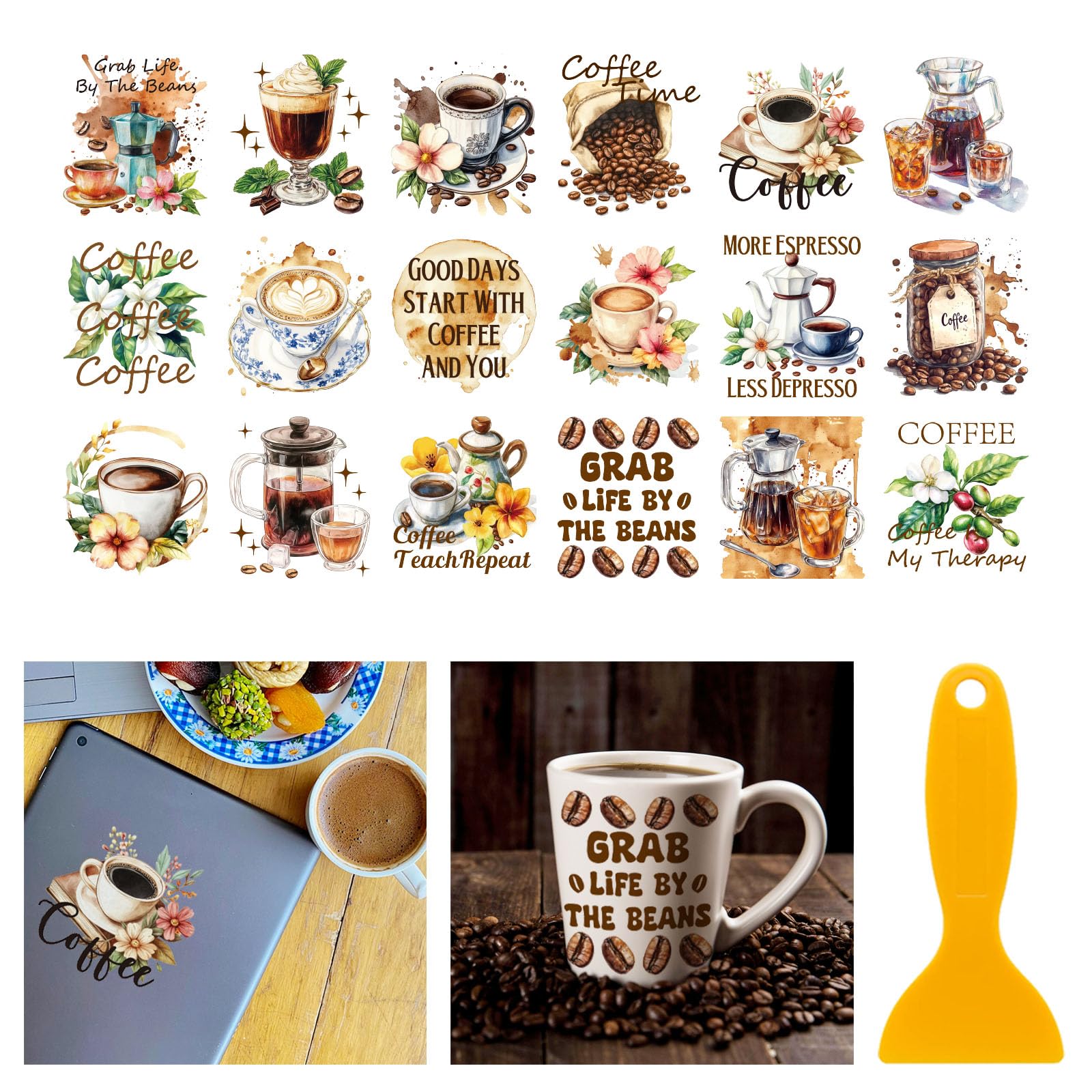 Kreativ werden mit diesen niedlichen Kaffee-Transferaufklebern! Das Set enthält 18 Blatt mit verschiedenen Motiven rund um Kaffee, Cappuccino und Donuts. Jeder Aufkleber ist 10x9 cm groß - perfekt für Möbel, Glas, Holz oder dein Fotoalbum. Einfach zu verwenden: Die Schutzfolie abziehen, Aufkleber auf die gewünschte Oberfläche positionieren und mit dem beiliegenden Schaber von der Mitte nach außen reiben. Dann die Plastikschicht langsam abziehen - schon ist das Motiv übertragen! Kein zusätzlicher Kleber nötig. Die Aufkleber aus hochwertigem UV-Plastik sind widerstandsfähig und passen sich auch gebogenen Oberflächen an. Unter Licht entfalten sie ihren besonderen Charme. Wichtig: Nur auf glatten Oberflächen wie Glas, Kunststoff, Porzellan, Holz oder Metall verwenden. Nicht für unebene Flächen, Papier oder Kleidung geeignet. So verleihst du deinen Lieblingsobjekten im Handumdrehen einen persönlichen Touch mit coffee-aesthetic! Einfach mal ausprobieren und deine Umgebung verschönern.