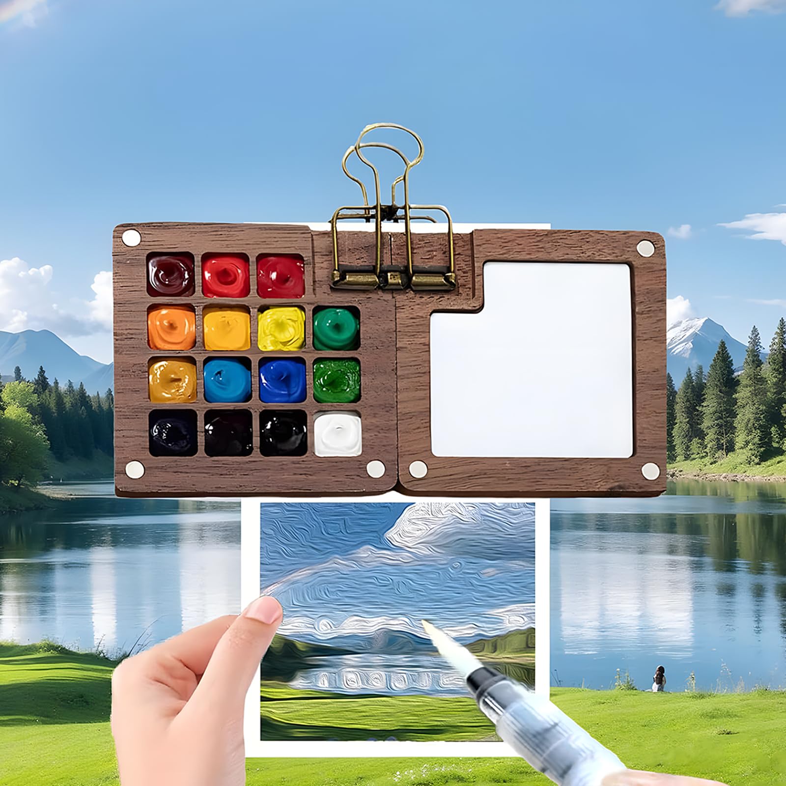 Traditionelle Aquarellpalette aus massivem Walnussholz! Mit 24 abnehmbaren Farbgittern und praktischem Deckel. \\n\\nMaße: 18 x 6,5 x 1,8 cm - kompakt und perfekt für unterwegs. Aus hochwertigem Walnussholz - klassisch und langlebig. \\n\\nFeatures: \\n- 24 abnehmbare Farbraster \\n- Stabiler Deckel verschließt dicht \\n- Leicht zu reinigen \\n- Zeitloses Holzdesign \\n\\nIdeal für: \\n- Outdoor Malerei \\n- Kunstunterricht \\n- Hobby Künstler \\n- Reise und Skizzen \\n\\nAlles griffbereit für deine kreativen Momente - die perfekte Begleitung für jeden Maler!