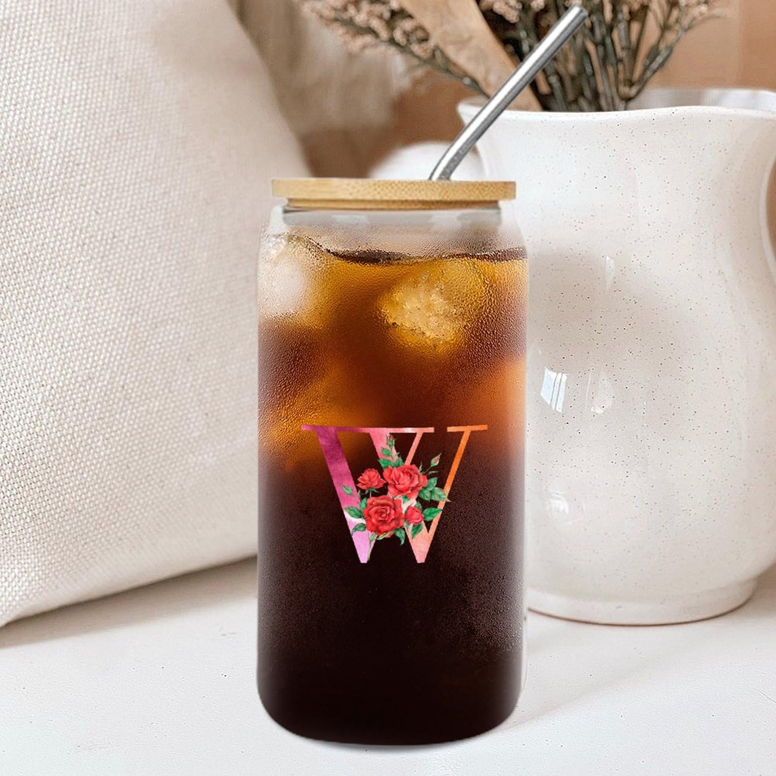 Yelolyio Glas Mit Deckel 500ml - Bambusdeckel & Edelstahl Strohhalm | Monogramm Design