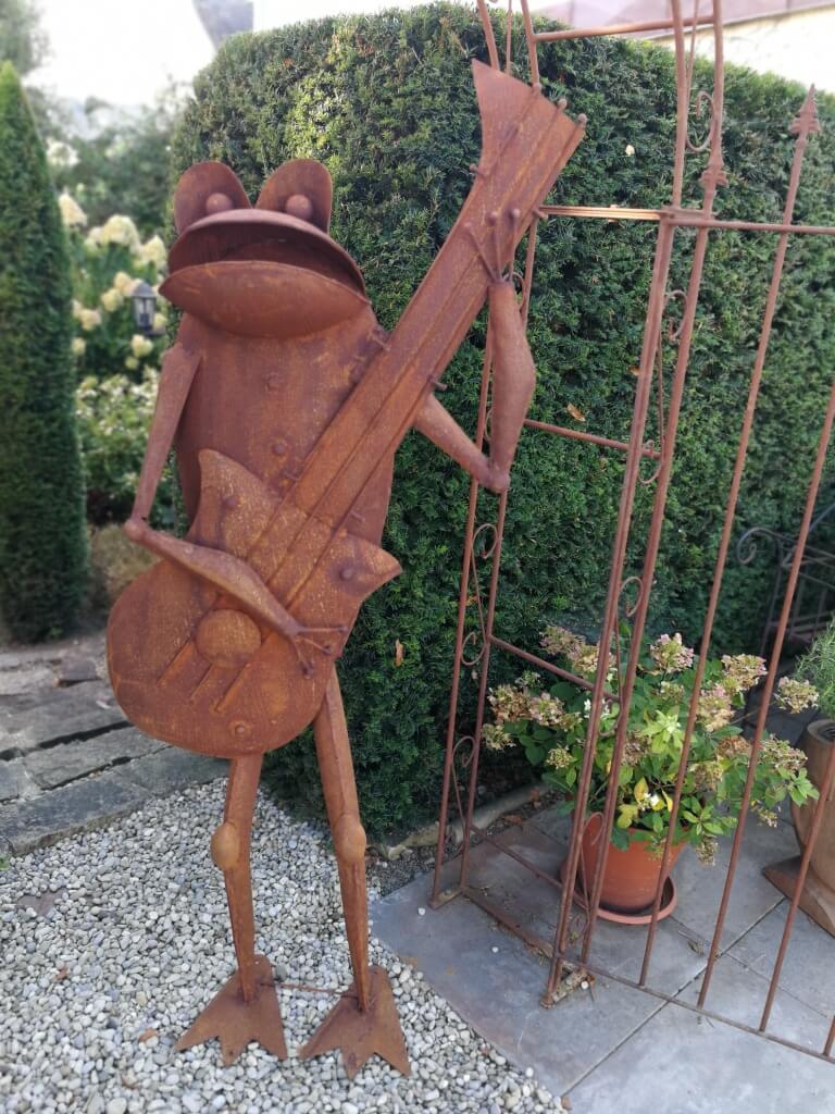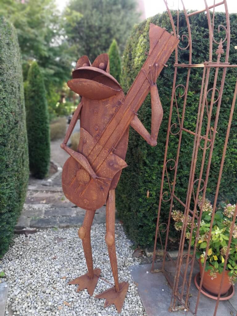 Wie süß ist denn dieser musizierende Frosch? Diese Gartenfigur aus Metall bringt Leben in deinen Garten! Detailreich lackiert in grün, weiß, schwarz und braun. Mit 30x23x16 cm die perfekte Größe für Beet, Terrasse oder Balkon. Aber nicht nur im Garten - auch im Wohnzimmer oder auf der Fensterbank macht er eine gute Figur. Ein tolles Geschenk für Gartenfreunde, zum Geburtstag oder einfach so. Die Qualität stimmt, das Design bezaubert. Einfach hinstellen und sich an dem fröhlichen Frosch erfreuen. Der Hingucker in jedem Garten!