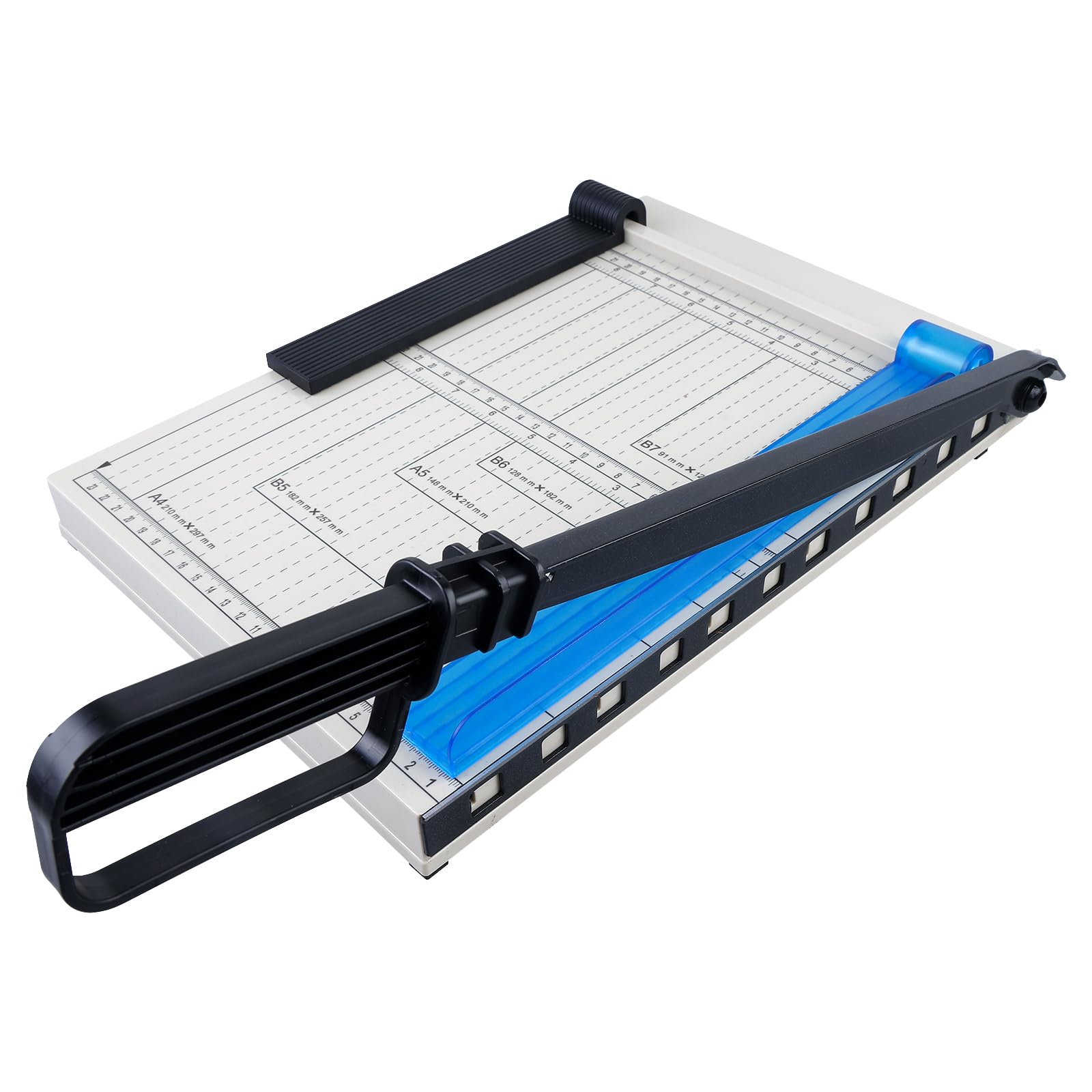 Hey, dieser A4 Papierschneider ist ein echter Alleskönner für alle, die viel mit Papier arbeiten! Ob im Büro, in der Schule oder fürs Hobby - der schneidet einfach alles präzise und sauber zu.\\n\\nDas coole: Der Hebelmechanismus macht das Schneiden super einfach. Du musst nicht viel Kraft aufwenden, trotzdem schneidet die Klinge selbst durch 16 Blätter Papier auf einmal. Und das ohne Fransen oder gezackte Kanten - einfach saubere, gerade Schnitte.\\n\\nDie Maße sind perfekt für A4-Format: 385 x 257 x 75 mm, also nicht zu groß, aber groß genug für die meisten Projekte. Aus stabilem ABS-Material gebaut, wiegt etwa 1,6 kg - liegt gut in der Hand und verrutscht nicht.\\n\\nEgal ob du Karton, Cardstock oder normales Papier schneiden willst - dieser Schneider macht keinen Unterschied. Perfekt für Bastelprojekte, Präsentationen oder einfach um mal schnell was zurechtzuschneiden.\\n\\nDie gebogene Klinge und der ergonomische Griff sorgen für maximalen Komfort. Und die scharfe Klinge lässt sich leicht wechseln, wenn sie mal stumpf wird. Einfach ein praktisches Tool, das man nicht mehr missen möchte!
