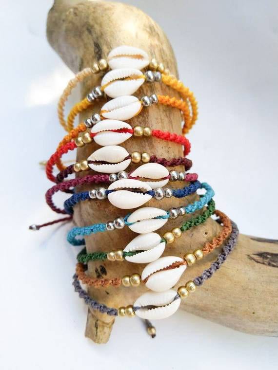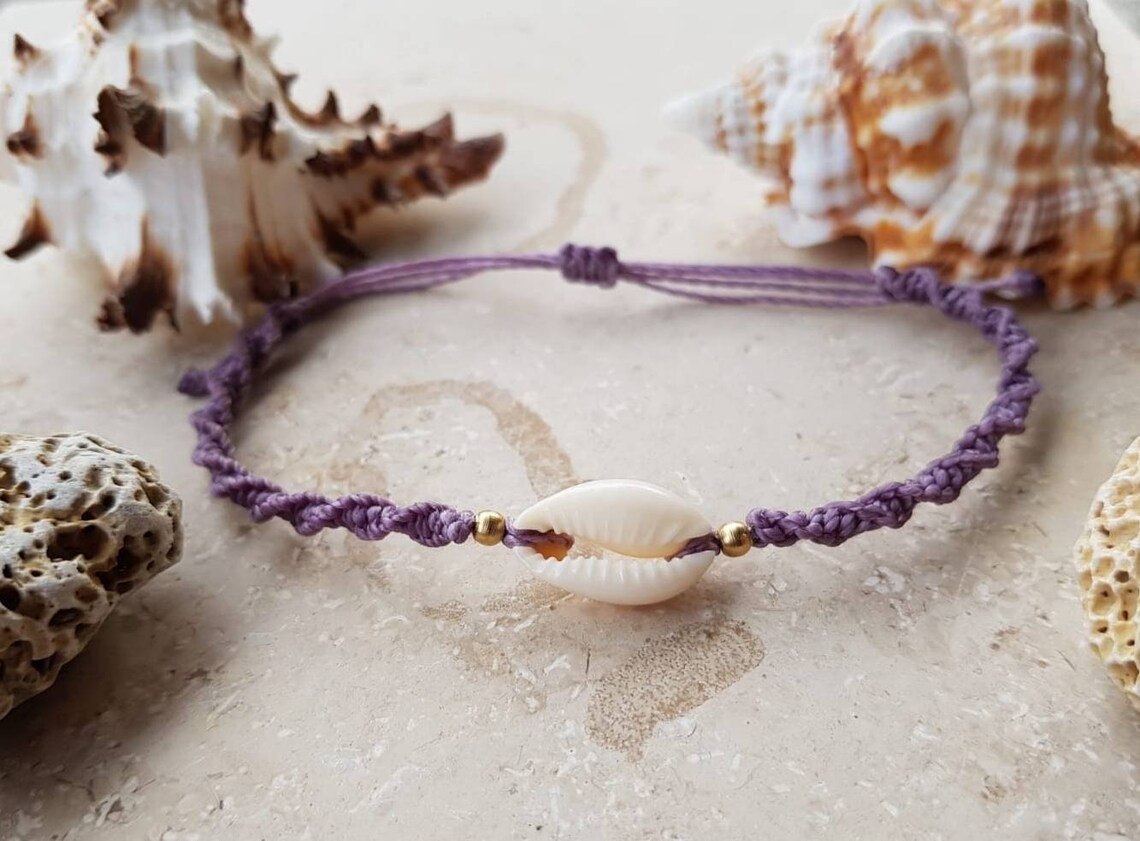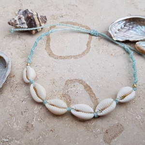 Total schönes Boho-Fußkettchen! Handgeknüpft im Makramee-Stil mit natürlichen Kauri-Muscheln und blauen Achat-Perlen. Das gewachste Baumwollgarn ist robust, wasserfest und liegt angenehm auf der Haut. Standard-umfang 23 cm, aber auf Wunsch in anderen Größen erhältlich. Der Kokos-Knopf-Verschluss mit Perlen-Anhängern sieht einfach edel aus. Wird mit der Zeit weicher und passt sich perfekt dem Fuß an. Perfekt für Strand, Festival oder als täglicher Begleiter. Echt ein Hingucker!