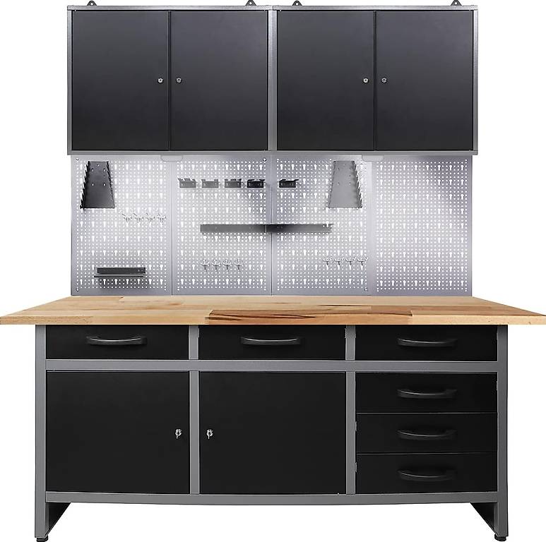 Träumst du von einer perfekt organisierten Werkstatt? Dieses All-in-One-Set macht's möglich! Mit stolzen 240cm Breite und 205cm Höhe bietet es alles, was das Heimwerker-Herz begehrt. Das Highlight: Integrierte LED-Beleuchtung mit 1000 Lumen und Bluetooth-Lautsprechern! Musik in der Werkstatt - was gibt's Besseres? Die versenkbare Steckdosenleiste mit 3 Steckplätzen verschwindet auf Knopfdruck in der Arbeitsplatte - nie wieder Kabelsalat. Praktische Sitznische für Feinarbeiten oder zum Unterstellen von Werkstattwagen. Zwei Schubladen und große Fächer bieten reichlich Stauraum für Werkzeug. Die abschließbaren Türen und Hängeschränke schützen dein Equipment. Mit Lochwand und Hakensortiment hast du alles griffbereit. Die zwei 28mm Buchenholzplatten aus Deutschland sind super stabil. Justierfüße gleichen Unebenheiten aus, kugelgelagerte Schubladen laufen butterweich. Einfache Selbstmontage nach Anleitung. Ob Hobbyraum oder professionelle Werkstatt - dieses Set verwandelt jeden Raum in ein Paradies für Bastler und Handwerker. Endlich Ordnung, Licht und Musik an einem Ort!