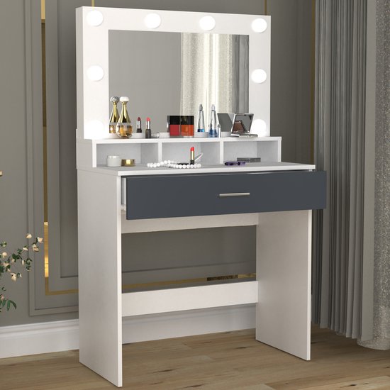 Dein neuer Beauty-Bereich wartet! Dieser VASAGLE Schminktisch aus der Kailyn Kollektion bietet alles, was du für deine Beauty-Routine brauchst. Mit LED-Spiegel in 3 Farben, integrierter Steckdosenleiste (2x AC, USB-A, USB-C) und jeder Menge Stauraum. Die verstellbaren Ablagen im unteren Schrank passen sich deinen Beauty-Produkten an. Aus robusten Spanplatten, grifflose Schubladen und modernes Weiß. Wichtig: Mit Kippschutz für sichere Nutzung! Maße: 40x80x132 cm. Hocker nicht enthalten. Schaff dir deinen persönlichen Beauty-Bereich - organisiert und stylisch!