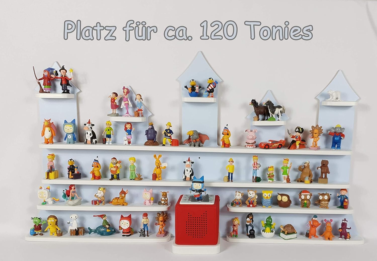 Endlich Ordnung im Tonie-Chaos! Dieses wunderschöne Tonie-Regal im Regenbogen-Design bietet Platz für ca. 25 deiner liebsten Hörfiguren. Mit 4 Regalböden und den Maßen 45x32cm passt es perfekt an jede Wand im Kinderzimmer. Das besondere Highlight: 20 magnetische Ferro-Sticker in Rosa sind enthalten - einfach auf die Tonie-Füße kleben und schon halten die Figuren sicher an ihrem Platz, sogar kopfüber! Keine sichtbaren Schrauben auf der Vorderseite durch innovatives Befestigungssystem - sieht super sauber aus. Alles Befestigungsmaterial ist im Lieferumfang enthalten. Hergestellt aus stabilem Hartschaum, 100% Made in Germany. Kindgerechtes Design in zarten Pastellfarben bringt Freude ins Zimmer. Einfache Montage - in wenigen Minuten ready für deine Tonie-Sammlung. Perfekte Geschenk-Idee für kleine Tonie-Fans und gestresste Eltern! Bring Ordnung in deine Hörspiel-Sammlung und mach das Kinderzimmer bunter.