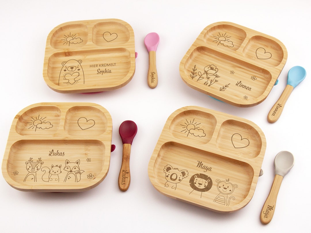 Das perfekte Geschenk für dein Baby! Dieses personalisierte 6-teilige Silikon Geschirrset lässt sich mit Namen und niedlichen Motiven individualisieren - ein einzigartiges Tauf- oder Geburtsgeschenk! Enthalten sind: Silikon-Lätzchen mit Auffangschale, Babyteller mit Saugnapf, Schüssel, Trinkbecher, Gabel und Löffel. Alles aus 100% lebensmittelechtem, BPA-freiem Silikon - spülmaschinenfest und hygienisch reinigbar. Der starke Saugnapf am Teller verhindert Umkippen und fördert selbstständiges Essen ab 6 Monaten. Wähle aus knallbunten Farben von Rosa bis Mint - garantiert nach dem Geschmack deines Kindes! Das Lätzchen fängt Kleckereien zuverlässig auf, während Teller und Schüssel bombenfest auf Hochstühlen haften. Perfekt für die Beikost-Phase und ideal als Esslernbesteck ab 1 Jahr. Mach jede Mahlzeit zum Freudenereignis und begleite dein Kind durch eine glückliche Kindheit! Ein Set, das mitwächst und immer eine persönliche Note behält. Einfach Namen wählen, Farbe aussuchen und loslegen!