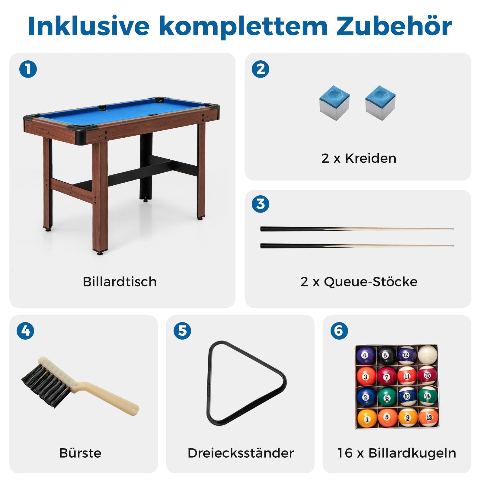 Hey, dieser Dreamade Billardtisch ist perfekt wenn du nicht so viel Platz hast! Mit 122x64cm ist er kompakt aber trotzdem groß genug für richtigen Spielspaß. Und das beste: Er ist klappbar! Von 78cm Höhe auf nur 11,5cm zusammengeklappt - super für kleine Wohnungen!\\n\\nIm Lieferumfang ist wirklich ALLES dabei: 16 Kugeln (1 weiß, 15 farbig), 2 Queues (92cm), Kreide, Dreieck, Bürste - einfach auspacken und sofort losspielen! Die Montage ist simpel mit der beiliegenden Anleitung.\\n\\nDie Oberfläche aus MDF ist super glatt und die gepolsterten Bänder sorgen für ein authentisches Spielgefühl. Die Metallbeine mit verstellbaren Füßen stehen auch auf unebenem Boden stabil!\\n\\nEgal ob für Kindergeburtstage, Familienabende oder Partys mit Freunden - dieser Tisch bringt Spaß für Groß und Klein! Und wenn du mal keinen Platz brauchst, einfach zusammenklappen und platzsparend verstauen. Perfekt als Geschenk für Weihnachten oder Geburtstage! Einfach aufbauen und stundenlang Spaß haben!