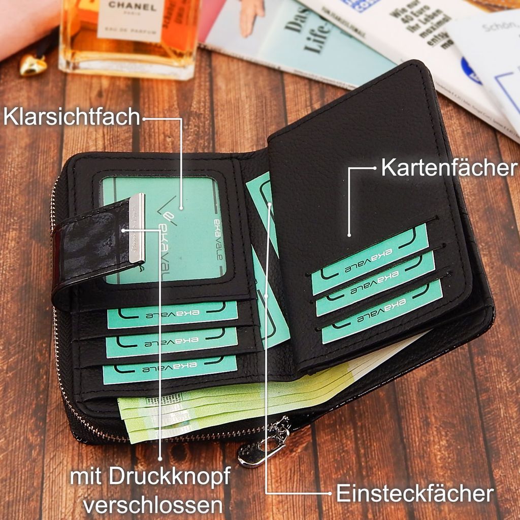 Diese hübsche Geldbörse hat alles, was du brauchst - und bleibt dabei schön schlank! Mit RFID-Schutz gegen unerwünschtes Auslesen deiner Karten. 6 Kartenfächer, 1 ID-Fenster und zwei Reißverschlussfächer für Münzen bieten genug Platz, ohne dass es unordentlich wird. Aus weichem PU-Leder, kratzfest und langlebig. Mit 14,5x10x2 cm perfekt für jede Handtasche. Die praktischen Quick-Access-Taschen vorne geben dir blitzschnell Zugriff auf deine Lieblingskarte. Schickes Design in Schwarz - ideal für Beruf, Alltag oder Reisen. Ein tolles Geschenk für jede Frau, die Ordnung und Stil mag!