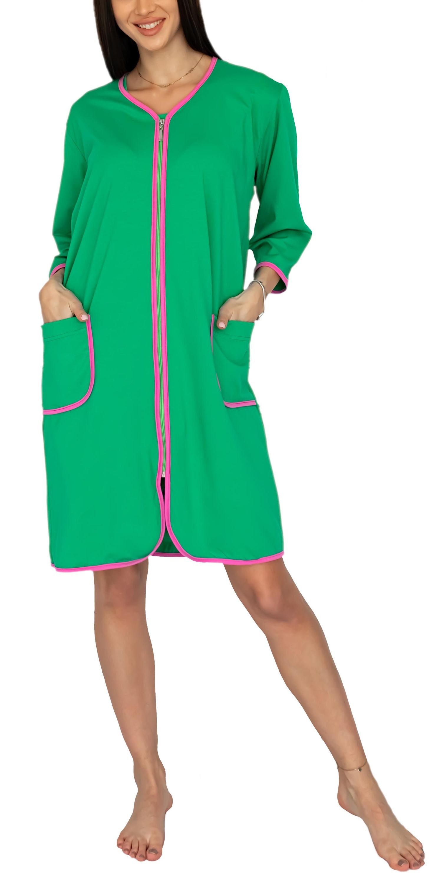 Mit praktischem Reißverschluss und zusätzlichem Bindegürtel sitzt der Bademantel immer perfekt. Die 3/4-Ärmel sind praktisch für Hausarbeiten und die beiden Taschen bieten Platz für Handy, Taschentücher oder die Fernbedienung. In knielanger Passform ist er bequem zu tragen, ohne zu stören.