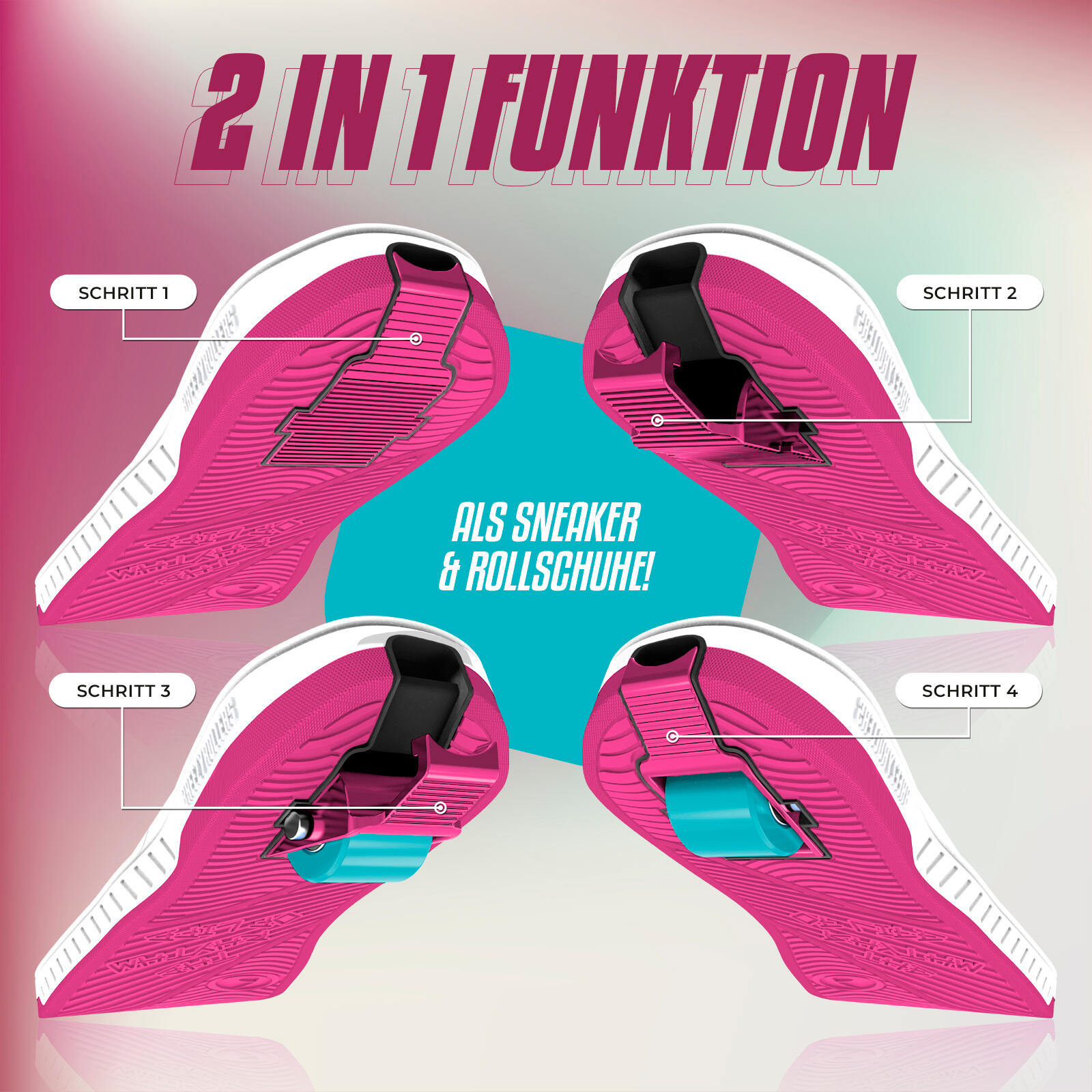 In pink/white sieht das Ganze total stylisch aus! Die Rollen sind aus robustem Kunststoff und halten was aus. Einfach zu transportieren - wenn du keine Lust mehr hast, nimmst du die Rollen raus und schon sind es wieder normale Schuhe!