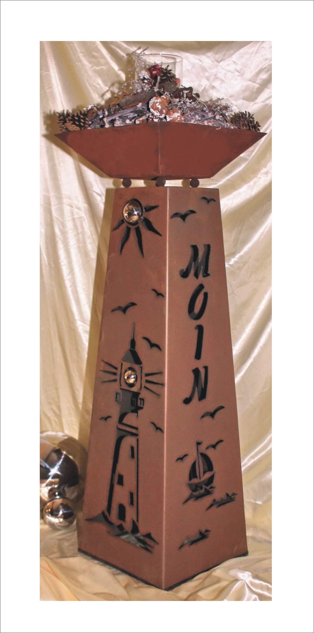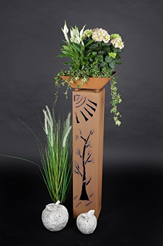 Garten-Liebhaber, diese Rost-Säule von Jabo Design ist ein absoluter Hingucker für euren Outdoor-Bereich! Die konische Säule mit passender Schale kommt im wunderschönen Edelrost-Look - und das Beste: Sie wird personalisiert mit eurem Namen oder Hausnummer! Die Säule misst stolze 100 cm Höhe, unten 33x33 cm und verjüngt sich nach oben auf 20x20 cm. Die dazu passende Schale ist 14 cm hoch und 38x38 cm breit - mit praktischen Wasserabflusslöchern. Das besondere Detail: Die 6 cm Edelstahlkugel als 'Sonne' und die zarte Blätterranken-Verzierung. Und weil sie unten offen ist, könnt ihr sie von innen beleuchten - ein traumhafter Anblick bei Gartenpartys oder abends! Wichtig: Gleich nach Bestellung den gewünschten Text (max. 10-12 Zeichen) mitteilen! Jedes Stück ist Handarbeit aus dem Emsland - da steckt Liebe drin! Der Naturrost entwickelt sich weiter und gibt jedem Stück seinen eigenen Charakter. Ein echter Blickfang, der euren Garten oder Wohnbereich aufwertet! Also überlegt euch einen coolen Text und macht diese einzigartige Deko zu eurem persönlichen Highlight!