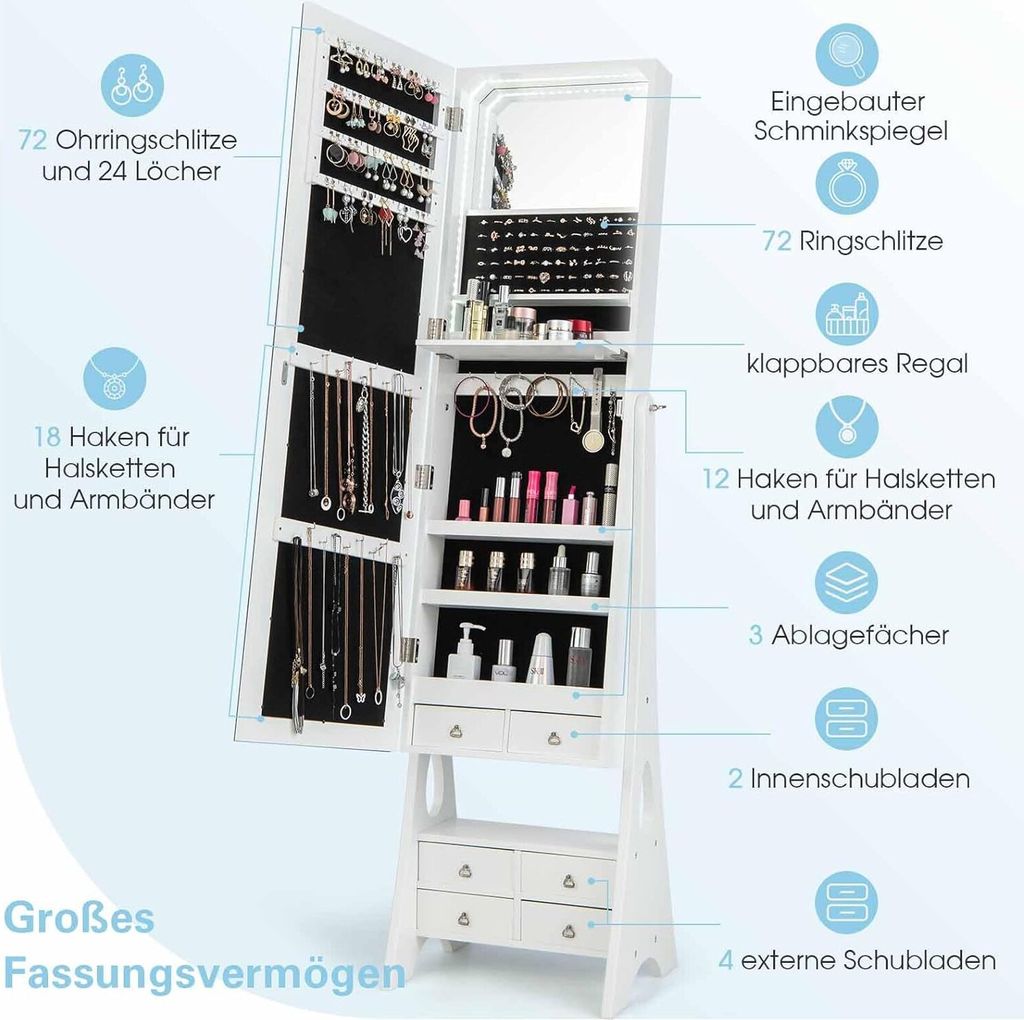 Endlich Ordnung im Schmuck-Chaos! Dieser fantastische COSTWAY Schmuckschrank ist deine persönliche Schmuck-Managerin. Mit 360° Drehfunktion erreichst du alles bequem von einer Position aus. Der große Ganzkörperspiegel (140x37 cm) zeigt dir dein Outfit von Kopf bis Fuß - super praktisch! Die integrierten LED-Leuchten machen jedes Schmuckstück zum Star - perfekt zum Schminken oder Auswählen. Und was der alles kann: 108 Ohrringfächer, 36 Halskettenhaken, 65 Ringfächer, 3 Armbandstangen, Lippenstiftbox und sogar einen Haartrocknerhalter! Die Acryl-Schubladen und -Regale halten alles organisiert. Besonders clever: Die Tür klappst du runter und hast sofort eine Make-up-Ablage. Mit den 2 Schlüsseln schließt du deine Schätze sicher ein - ideal wenn Kinder im Haus sind. Auf der Rückseite gibt's zusätzlich 3 Ablageflächen für noch mehr Stauraum. Maße: 56cm Durchmesser, 164cm hoch - platzsparend und trotzdem mega geräumig! In Braun, Rustikal Braun oder Weiß erhältlich. Ob im Schlafzimmer, Bad oder Ankleidezimmer - dieser Schmuckschrank ist nicht nur praktisch, sondern auch ein richtiger Hingucker. Dein Schmuck ist endlich geschützt vor Kratzern und Verwicklungen - und du findest sofort, was du suchst!