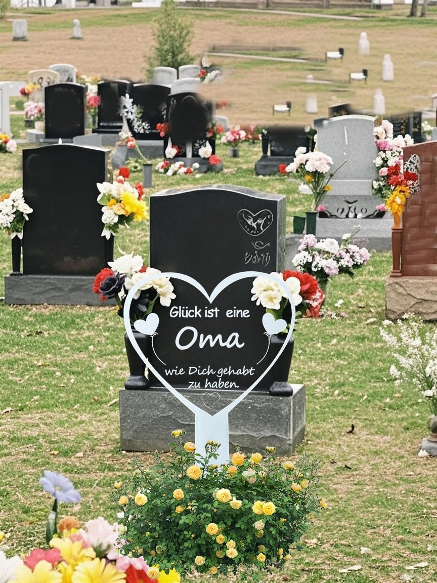 Ein wunderschöner Grabstecker, der deine Erinnerungen an geliebte Menschen würdevoll bewahrt. In Herzform mit den Maßen 16x26 cm ist er dezent und doch gut sichtbar. Die berührende Aufschrift 'Glück ist eine Mama/Oma... einen Papa/Opa wie Dich gehabt zu haben' spricht direkt aus dem Herzen. In elegantem Weiß gehalten, fügt er sich harmonisch in jede Grabgestaltung ein. Das Design mit den kleinen Herzballons und dem großen Herzrahmen verleiht dem Ganzen eine liebevolle Note. Besonders praktisch: Der Stecker ist komplett wetterfest und kann das ganze Jahr über draußen bleiben. Egal ob Regen, Schnee oder Sonne - die Farbe bleibt erhalten und das Material zeigt keine Ermüdungserscheinungen. Perfekt für Urnengräber oder traditionelle Grabstellen. Ein stilvolles Erinnerungsstück, das nicht nur die Grabstätte verschönert, sondern auch Trost spendet. Einfach in die Erde stecken und so deine Verbundenheit mit dem Verstorbenen zeigen. Ein Geschenk, das von Herzen kommt und bleibende Erinnerungen schafft.