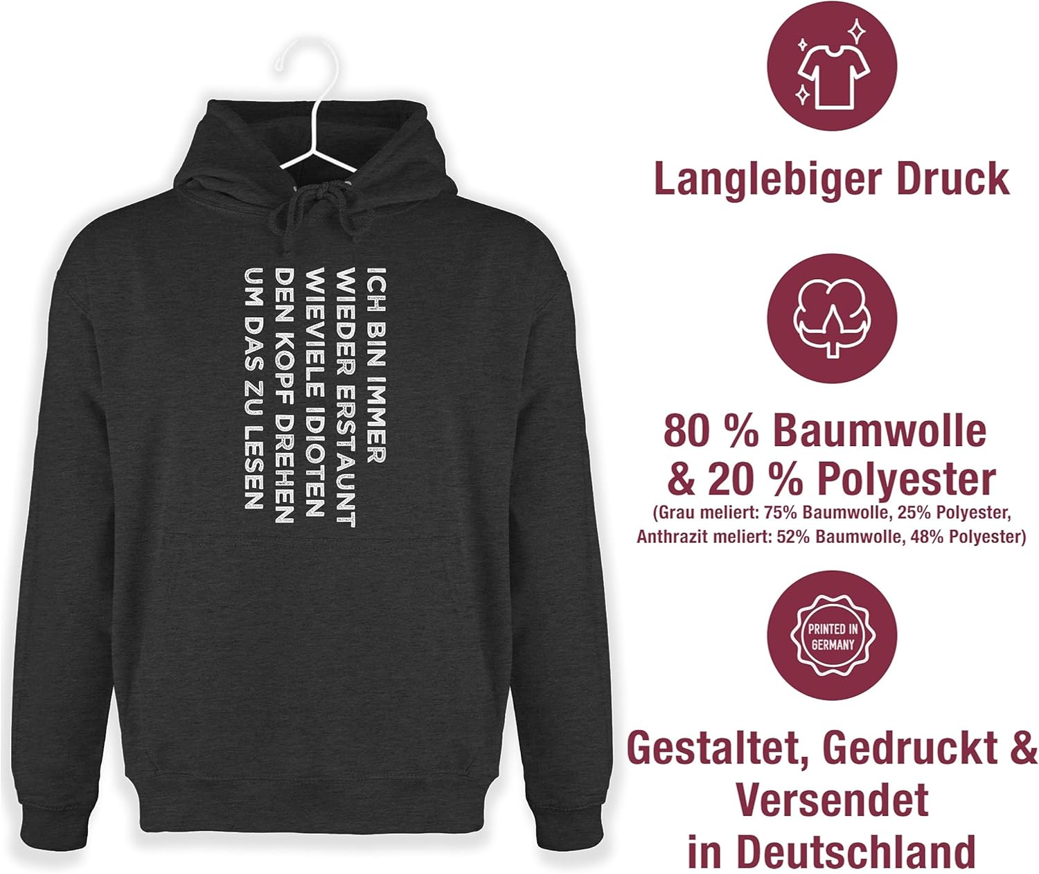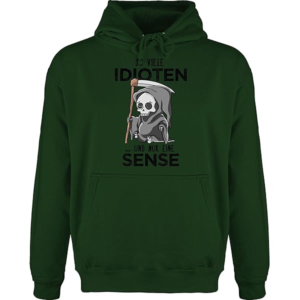 Dieser Hoodie von Shirtracer ist genau dein Ding, wenn du schwarzen Humor und sarkastische Sprüche liebst! Mit dem Motto 'So viele Idioten und nur eine Sense' in Weiß ziehst du garantiert Blicke auf dich - im positiven Sinne natürlich! Das Design mit Totenkopf und Sense ist perfekt für alle, die es ironisch und provokant mögen. Der Unisex-Hoodie besteht aus 80% Baumwolle und 20% Polyester, sitzt im bequemen Regular Fit und hat die typische Kapuze mit Kängurutasche. Perfekt für Herren, Damen und Teenager, die ihren eigenen Style leben wollen. Die Qualität stimmt: höhere Maschendichte für ein perfektes Druckbild und angenehme Dicke für Herbst und Winter. Einfach bei 30°C waschen und der Spaß hält lange. Ob als Geschenk für Kollegen, Freunde mit schwarzem Humor oder einfach für dich selbst - dieser Hoodie sorgt für Lacher und macht jeden Tag etwas ironischer. Die Motive werden übrigens in Süddeutschland designed, also unterstützt du auch noch regionale Kreative!