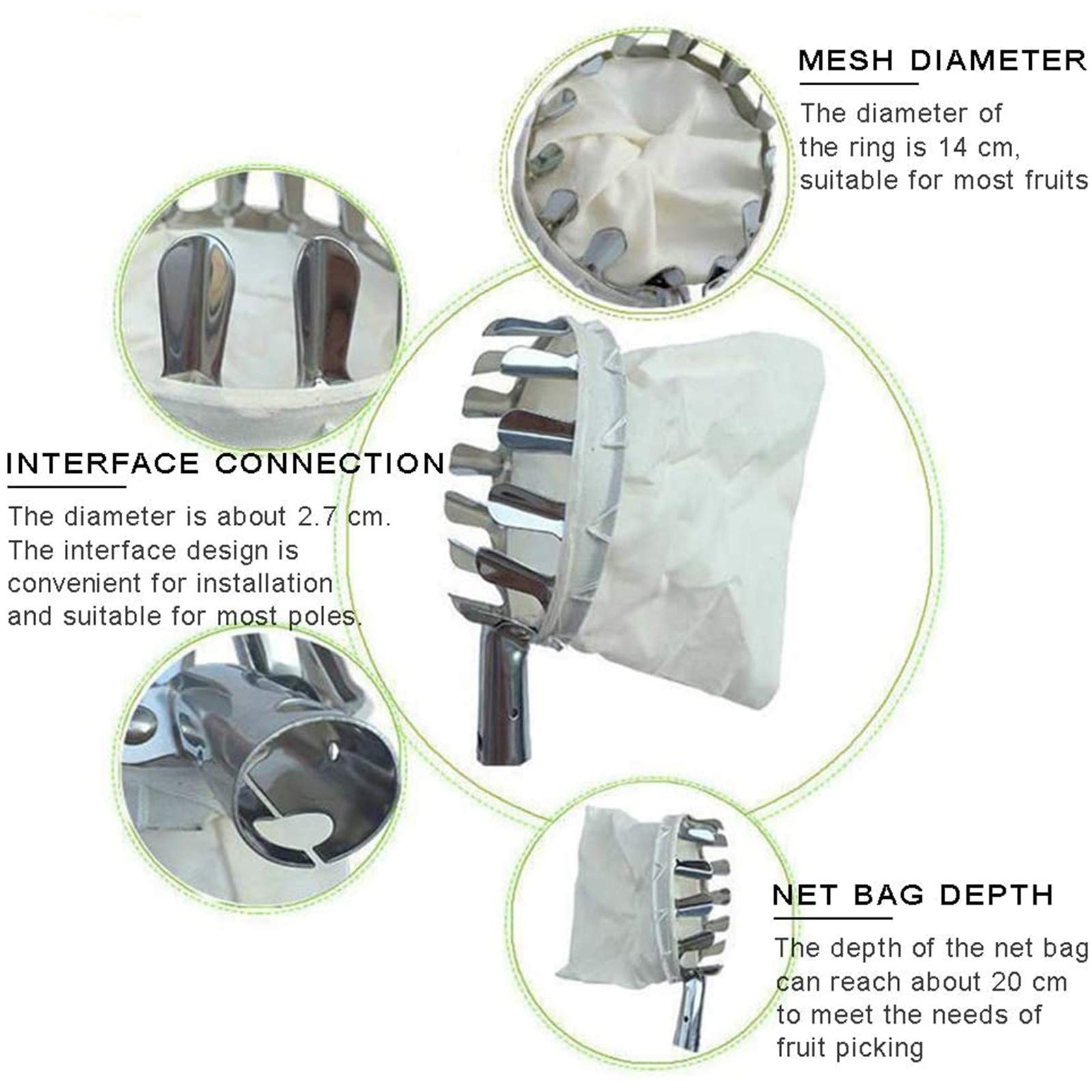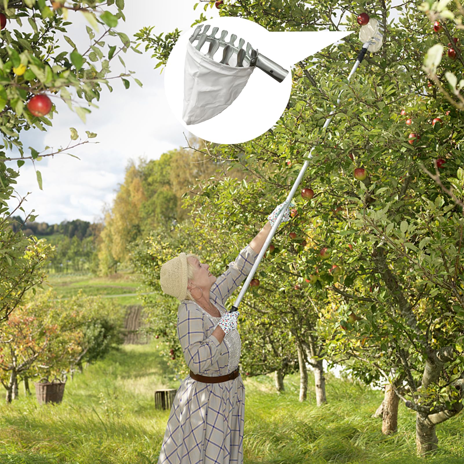Endlich musst du nicht mehr auf die wackelige Leiter klettern! Unser Obstpflücker aus Metall mit praktischem Baumwollbeutel macht die Ernte zum Kinderspiel. Einfach den Pflücker an einer Stange befestigen (Stange nicht im Lieferumfang) und schon kannst du Äpfel, Birnen, Pfirsiche und Kirschen ganz bequem vom Boden aus pflücken. Die speziellen Ringzähne schonen das Obst, während der weiche Baumwollbeutel verhindert, dass was runterfällt. Mit 15 cm Durchmesser und 20 cm Tiefe passt erstaunlich viel rein! Das robuste Metall rostet nicht und hält ewig. Perfekt für den heimischen Garten, Obstplantagen oder den Park - wo immer leckere Früchte auf dich warten. Glaub mir, dein Rücken wird's dir danken!
