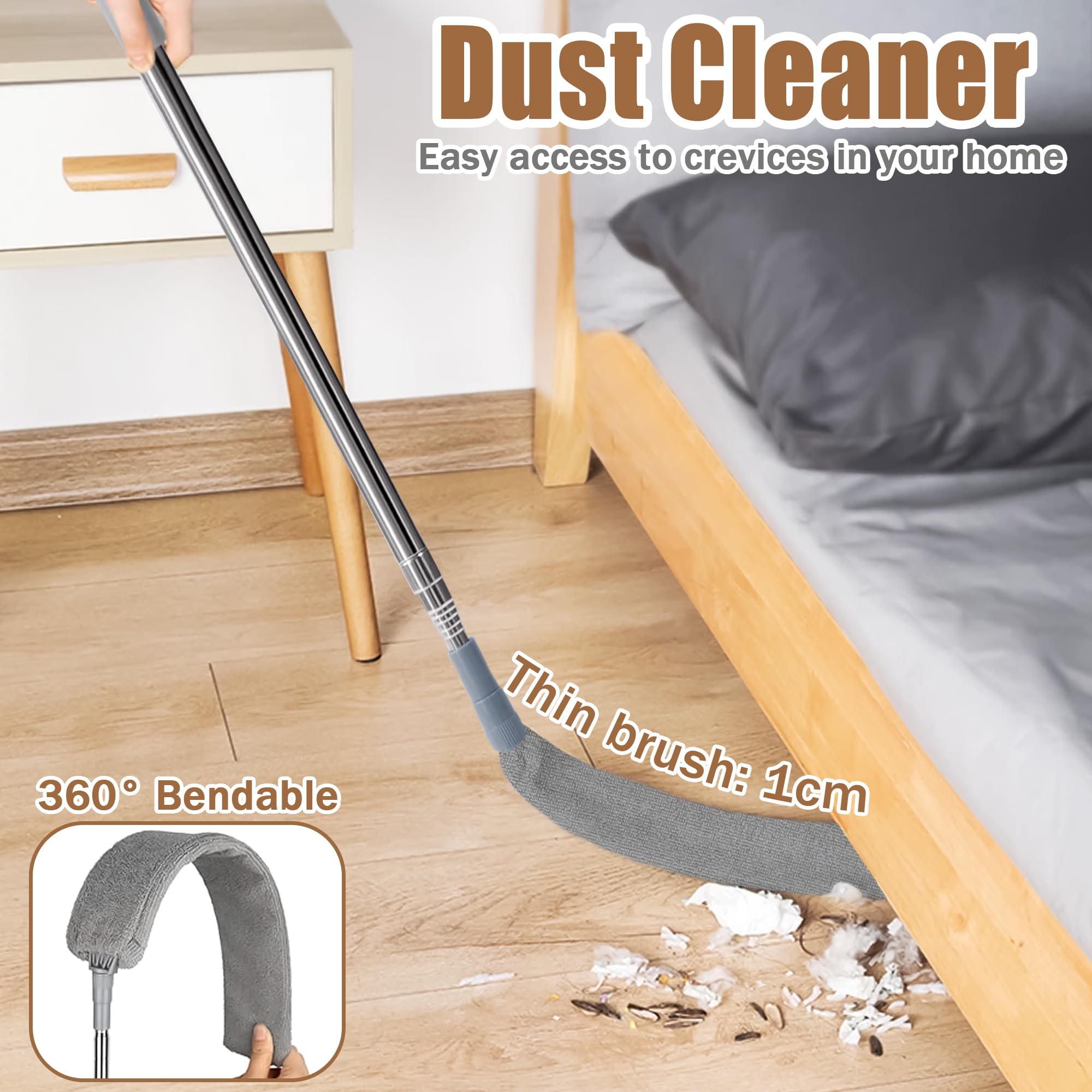 Puh, Staubwischen war noch nie so easy! Dieser einziehbare Staubwischer mit Teleskopstiel kommt auch an die unmöglichsten Ecken – unter dem Sofa, hinterm Schrank oder sogar an der Decke. Der ultraflache Kopf ist nur 0,8 cm dick und lässt sich beliebig biegen.