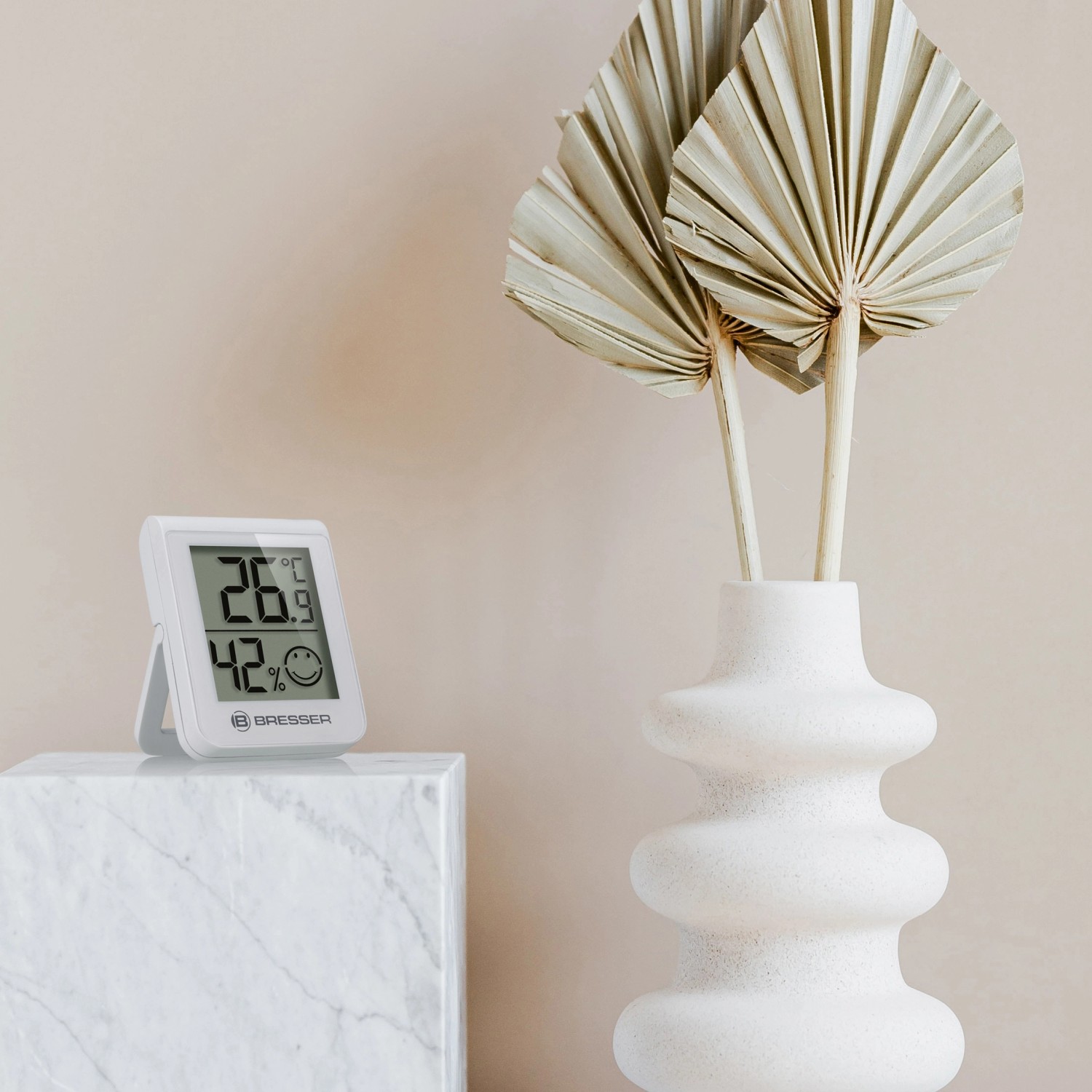 Perfekt für Zuhause, Büro oder Schule. Maße: 13x3x7cm, benötigt 2 AAA Batterien (nicht enthalten). Aus ABS-Kunststoff in elegantem Weiß. So behältst du immer die Kontrolle über dein Raumklima!