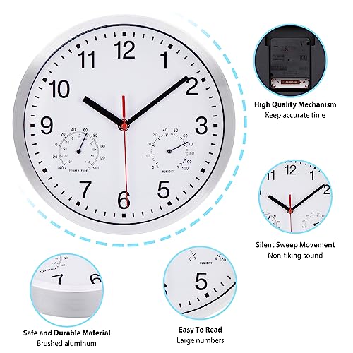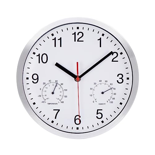 Also diese Wanduhr ist echt vielseitig! Die zeigt dir nicht nur die Uhrzeit an, sondern auch die Temperatur und Luftfeuchtigkeit. Super praktisch für Küche, Bad, Wohnzimmer oder sogar draußen auf dem Balkon! Das 25 cm Zifferblatt ist mega gut ablesbar mit den großen schwarzen Zahlen auf weißem Grund. Und das Beste: Die Uhr tickt nicht - total leise, nervt also nicht beim Entspannen oder Arbeiten. Das wasserdichte Design macht sie super robust gegen Regen, Feuchtigkeit und Staub. Der Retro-Rahmen sieht dabei richtig schick aus und passt in fast jede Einrichtung. Einfach aufhängen und du hast immer alle Infos auf einen Blick - Zeit, wie warm's ist und ob die Luft zu trocken oder zu feucht wird. Perfekt für alle, die's praktisch und stylish mögen! Die Uhr hält auch bei Sonne, Regen oder Schnee problemlos durch - einfach ein Allrounder für drinnen und draußen.