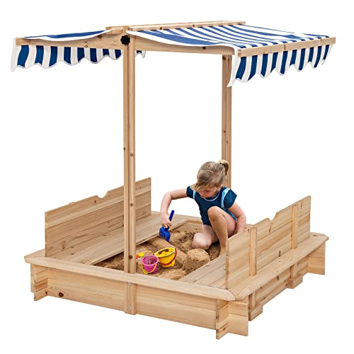 Endlich ein Sandkasten, der mehr kann! Dieses coole Spielhaus aus Holz hat ein verstellbares Dach - du kannst es je nach Sonnenstand anpassen, damit deine Kinder immer im Schatten spielen können. Super praktisch: Der Sandkasten kommt komplett mit Bodenmatte und Gewebestoff, damit nichts ausläuft. Das Holz ist speziell lackiert (Tauchverfahren) und hält auch bei Regen und Sonne lange. Noch ein Pluspunkt: Der Sandkasten hat kein festes Bodenbrett, sondern eine PVC-Matte - das heißt, Wasser kann einfach ablaufen und der Sand trocknet schneller. Mit dabei sind sogar zwei rechteckige Behälter, in die die Kinder den Sand schaufeln können. Der Aufbau ist simpler als gedacht - mit der beiliegenden Anleitung kriegst du das hin! Und die abgerundeten Ecken sorgen dafür, dass sich niemand verletzt. Für Kinder von 3-14 Jahren geeignet und hält bis zu 100 kg aus. Perfekt für Garten, Terrasse oder Balkon - deine Kinder werden stundenlang beschäftigt sein!