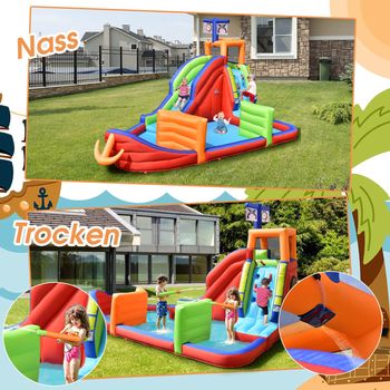 Der absolute Hit für den Sommer! Diese riesige 6-in-1 Hüpfburg (360x290x200cm) bringt Kinderaugen zum Leuchten. Mit langer Wasserrutsche, die in ein Planschbecken führt, Kletterwand, Zielspiel und Hüpfbereich. Aus verdicktem Oxford-Stoff - extra stabil und langlebig. Die Netzwände sorgen für Sicherheit beim Springen. Für bis zu 4 Kinder von 3-12 Jahren (max. 30kg pro Kind). Inklusive 450W Gebläse, Tragetasche, Erdspießen und Reparaturflicken. Einfacher Aufbau in wenigen Minuten. Perfekt für Gartenpartys, Geburtstage oder einfach für heiße Sommertage. Unvergesslicher Spaß für deine kleinen Wasserratten!