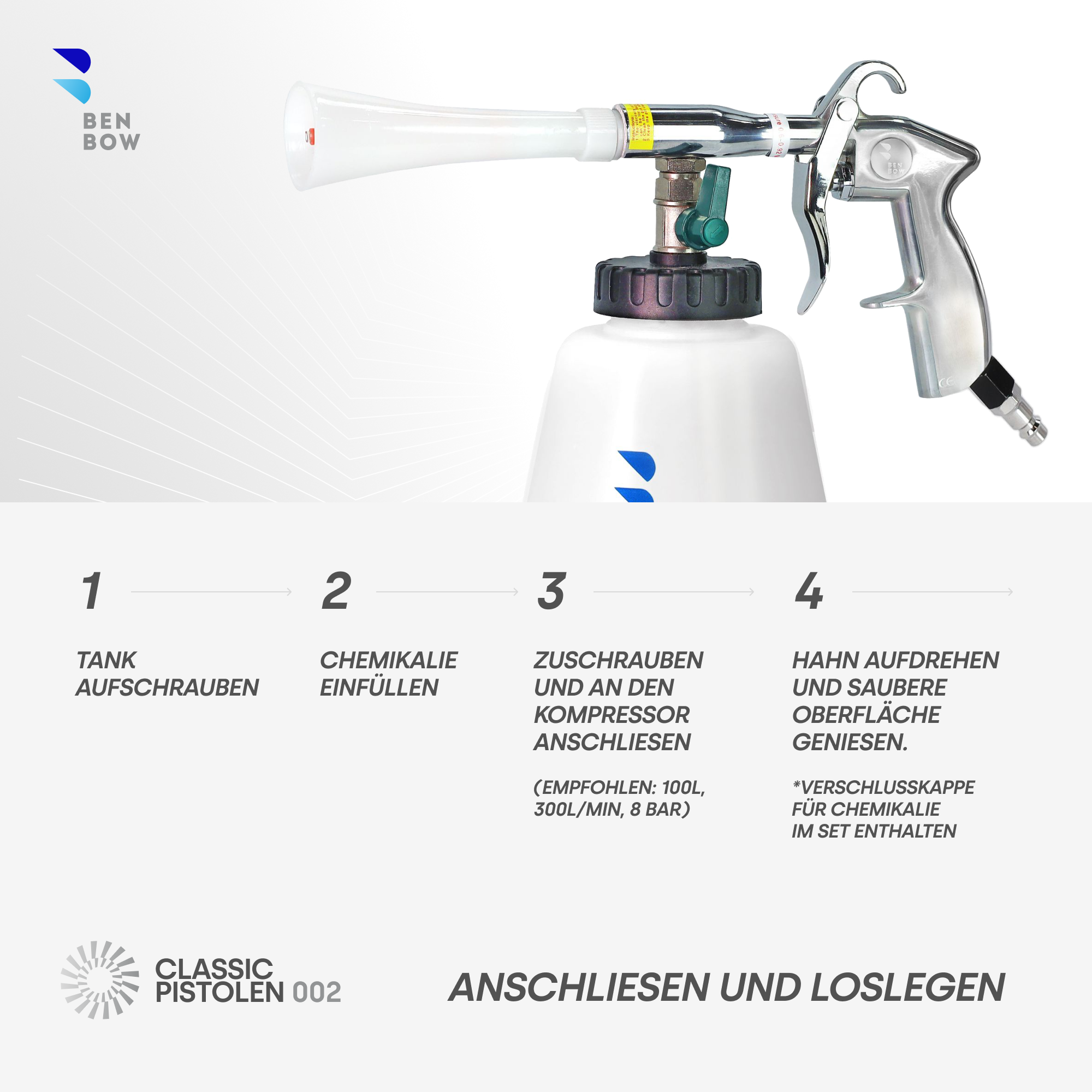 Gründliche Reinigung war noch nie so einfach! Die GEARLINE Druckluftpistole mit Wirbelstrahl-Technologie entfernt Staub und Schmutz, wo andere Werkzeuge versagen. Perfekt fürs Auto - ob Polster, Leder oder Teppiche - aber auch für Holz, Stein und Metall geeignet. Im Set dabei: Wassertank, 2 Düsenaufsätze inkl. Bürste, Schläuche und eine einfache Anleitung. Einfach Reinigungsmittel einfüllen, Kompressor anschließen und los geht's! Die Rotationsstrahl-Funktion löst selbst eingebrannten Schmutz und verteilt das Wasser gleichmäßig. Profi-Qualität für Heimwerker und Autofans. Nie wieder mühsame Handreinigung - mit Druckluft geht alles leichter! Ideal für Werkstatt, Garage oder Haushalt. Deine neue Lieblingshilfe für blitzblanke Ergebnisse!