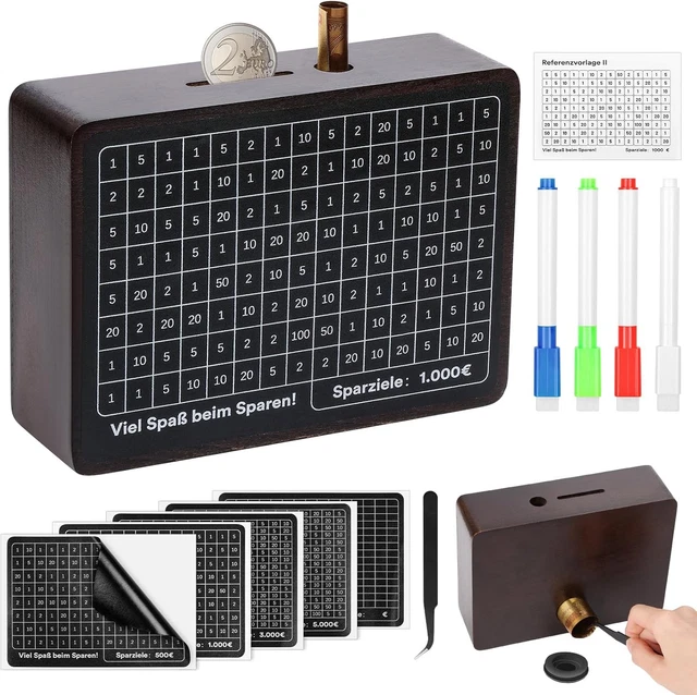 Wie cool ist denn diese Spardose aus Holz! Mit praktischem Zähler und verschiedenen Sparziel-Aufklebern von 500€ bis 10.000€. Einfach zusammengesteckt - kein Kleber nötig. Aus hochwertigem Holz, robust und langlebig. Mit wasserlöslichem Stift die Ziele markieren und wenn erreicht, einfach abwischen und neu starten. Perfekt für Kinder um Sparen zu lernen, aber auch für Erwachsene super. Sieht dazu noch schick aus als Deko. Ein klasse Geschenk zu Geburtstag oder Weihnachten - nicht nur praktisch, sondern macht auch noch Spaß!