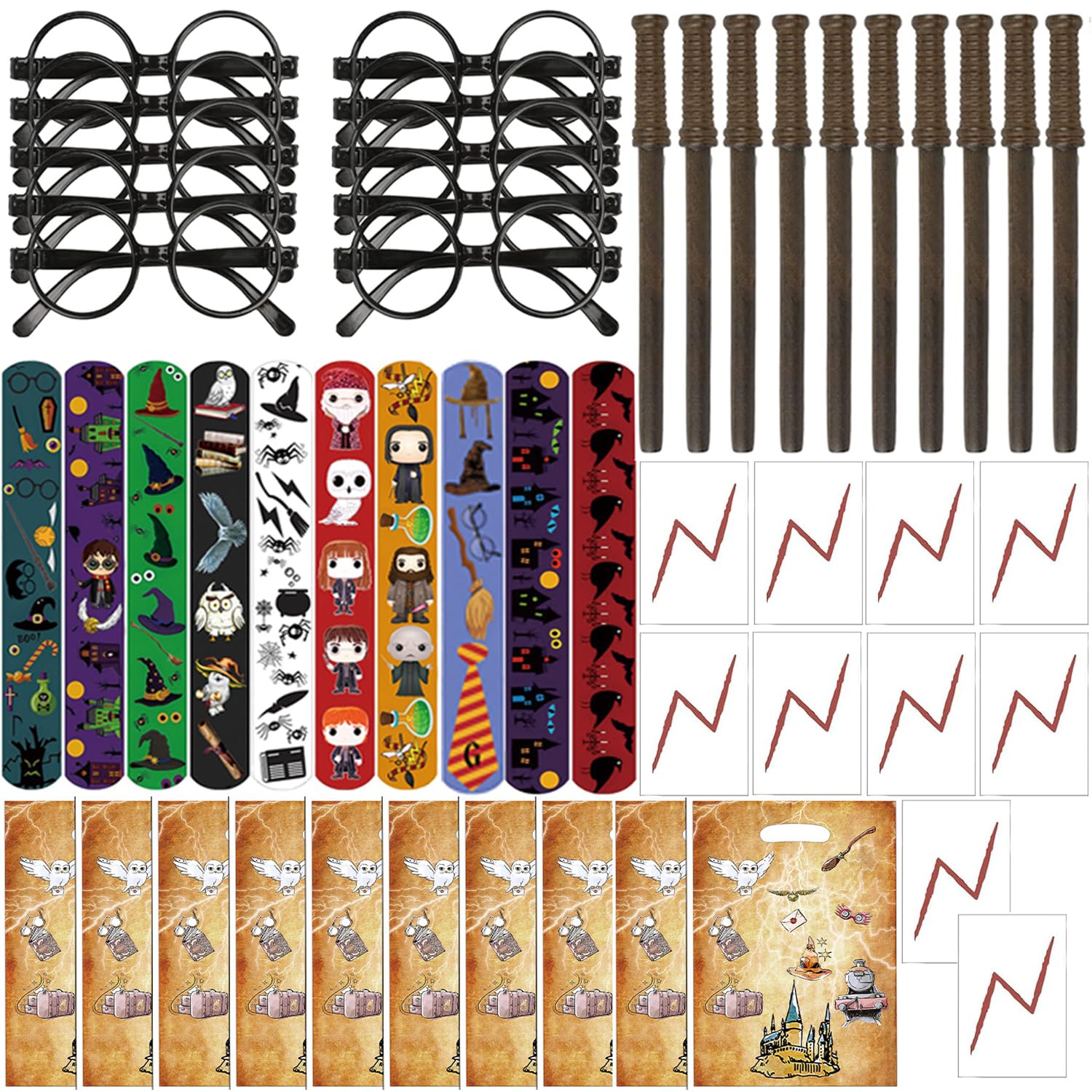 Alaaf! Für die ultimative Zauberer-Party ist dieses 50-teilige Mitgebsel-Set genau das Richtige! Da sind die kleinen Magier ganz aus dem Häuschen. Im Set findest du 10 richtig coole Zauberstab-Stifte - die kannst du nicht nur zum Zaubern, sondern auch zum Schreiben und Malen benutzen. Dazu kommen 10 Magic Slap-Armbänder in verschiedenen Designs, die einfach am Handgelenk festklatschen. Die 10 Zauberer-Brillen ohne Gläser sehen total lustig aus und passen mit ihrem flexiblen Rahmen an jede Gesichtsgröße. Als besonderes Highlight gibt's 10 Blitz-Tattoos - genau wie Harry Potter! Und für die ganzen Süßigkeiten und kleinen Geschenke sind 10 bunte Plastiktüten dabei. Alles ist aus kinderfreundlichen Materialien gemacht: Die Brillen aus stabilem Kunststoff und die Zauberstab-Stifte aus glattem Holz ohne scharfe Kanten. Perfekt nicht nur für Kindergeburtstage, sondern auch für Halloween, Schulfeste oder Karneval. Damit wird jede Party zum magischen Erlebnis - und die Kleinen können stundenlang ihre Fantasie ausleben!