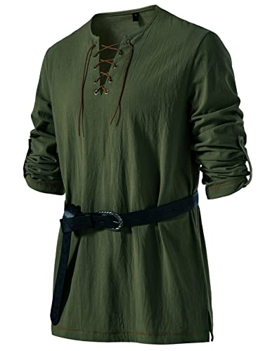Fühl dich wie ein echter Wikinger oder Pirat! Dieses Leinenhemd im Mittelalter-Stil ist perfekt für Mottopartys, Renaissance-Feste oder einfach nur für einen lässigen Look. Aus einer angenehmen Baumwoll-Leinen-Mischung gefertigt - super bequem und ideal für warme Tage. Der Schnürverschluss am Hals und die krempelbaren Ärmel geben dem Hemd diesen authentischen Vintage-Look. Dazu passt es super zu Kilts, Jeans oder Freizeithosen! Ob für Halloween, Mittelaltermärkte, Festival oder Strandparty - mit diesem Hemd bist du der Hingucker! Einfach in der Maschine waschbar - praktisch für alle Abenteuer. Sieht alleine schon cool aus, aber mit passender Hose und Accessoires wird's noch authentischer! Perfektes Geschenk für Väter, Brüder oder Freunde, die was Besonderes suchen. Mach dein nächstes Kostüm-Event unvergesslich - dieses Hemd bringt dich in die richtige Stimmung! Von NANAMEEI - die wissen, wie man gute Mittelalter-Kleidung macht!