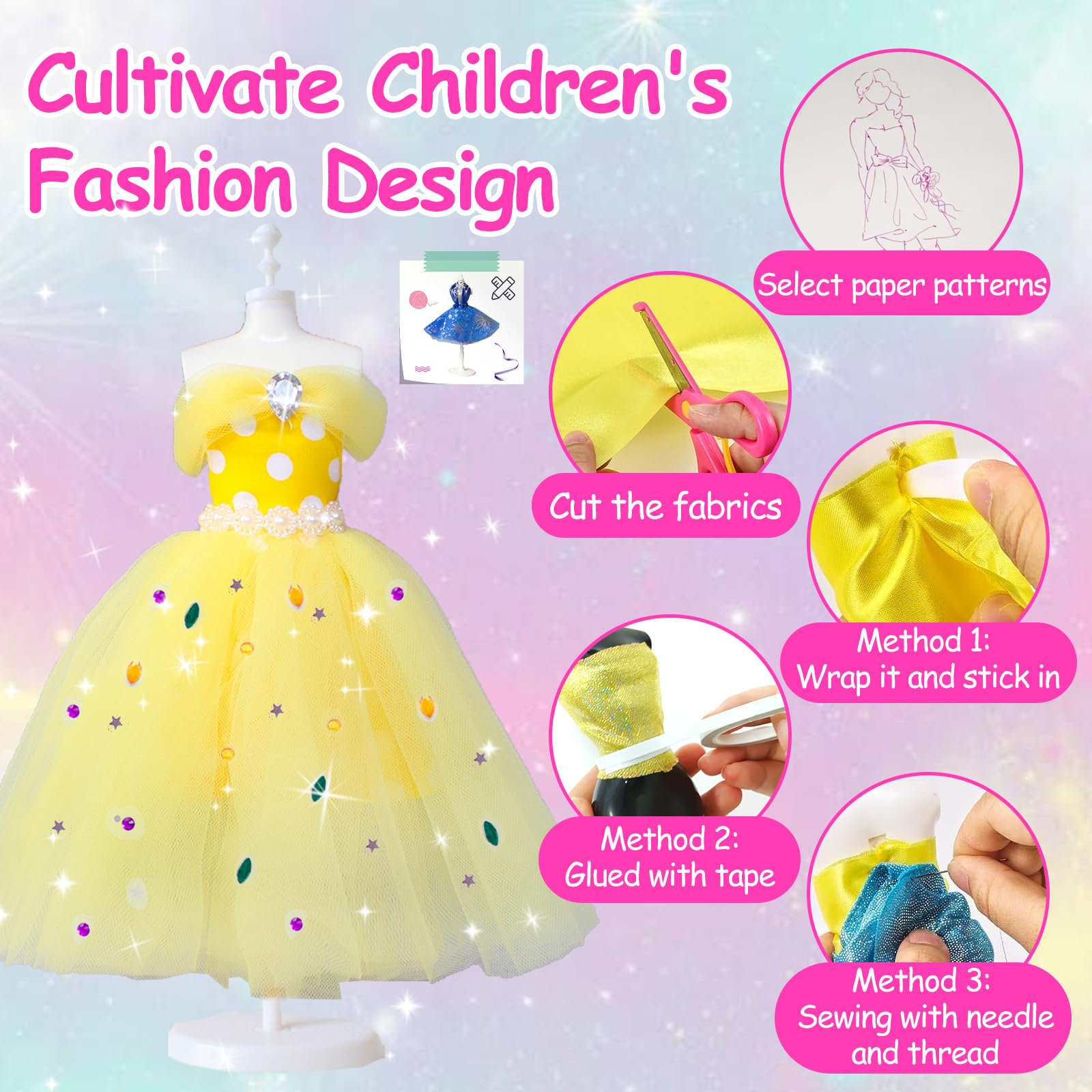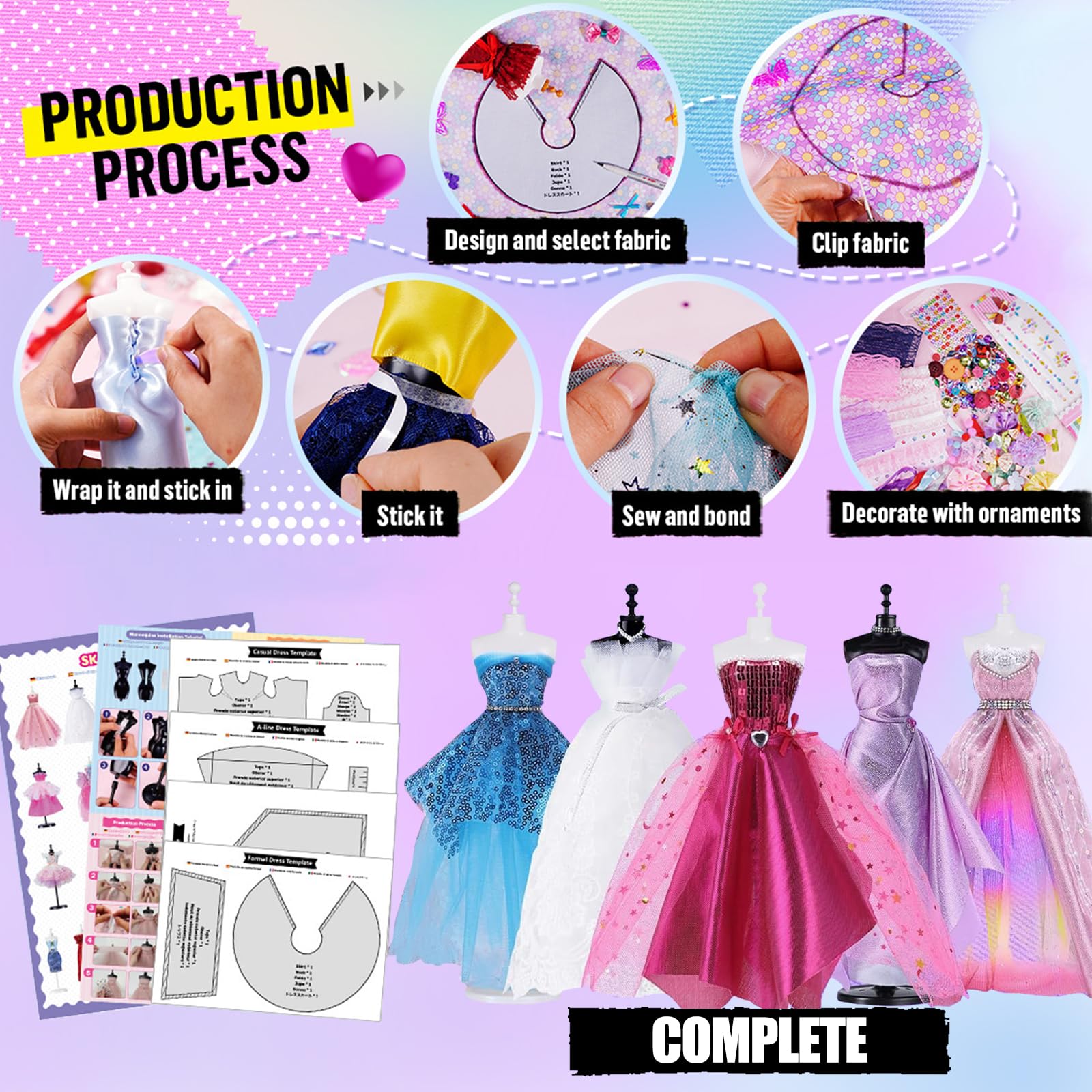 Wow, hier können kleine Modedesigner richtig loslegen! Dieses vollständige Set verwandelt Mädchen ab 6 Jahren in echte Fashion-Designer. Mit zwei verschiedenen Schaufensterpuppen, über 500 Teilen und jeder Menge Stoffen wird jeder Traum von der eigenen Modenschau wahr.\\n\\nWas alles dabei ist:\\n• 2 Schaufensterpuppen (eine für Stecknadeln, eine zum Bündeln)\\n• 16 verschiedene Stoffe in Volltonfarben, Glitzer und Spitze\\n• Komplettes Nähset mit Nadeln, Faden und Einfädler\\n• 10 niedliche Puppenschuhe und 10 Halsketten\\n• 30 Verzierungen wie Blumen, Schleifen und Perlen\\n• Strass-Aufkleber, Bänder, Einhorn-Deko\\n• Skizzenbuch für erste Entwürfe\\n• Sicherheitsschere und Bandmaß\\n\\nSo macht's Spaß: Erst im Skizzenbuch den Traum entwerfen, dann den passenden Stoff aussuchen und entweder mit Clips fixieren oder richtig nähen lernen. Die Ergebnisse können dann stolz auf der Schaufensterpuppe präsentiert werden!\\n\\nPerfekt für:\\n• Geburtstage von 6-12 Jahren\\n• Kreative Nachmittage\\n• Förderung von Feinmotorik und Ästhetik\\n• Zukunftsträume als Modedesignerin\\n\\nAchtung: Enthält Nadeln - bitte unter Aufsicht von Erwachsenen verwenden! In der schön gestalteten Geschenkbox kommt dieses Set richtig edel daher und ist das perfekte Geschenk für alle modebegeisterten Mädchen.