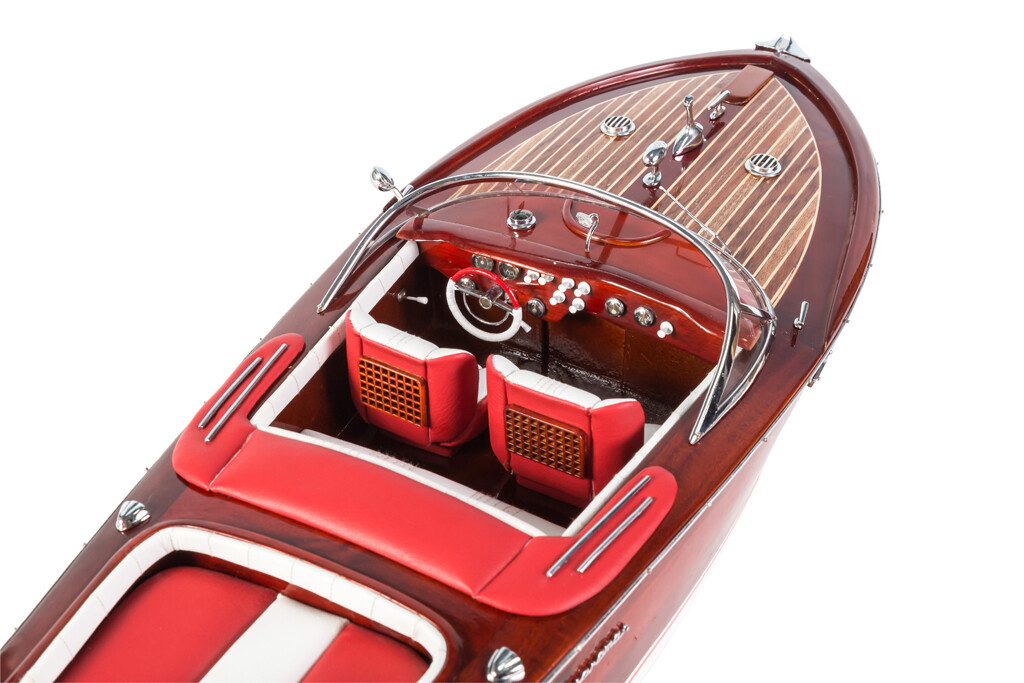 Boah, dieses Riva Aquarama Modellboot ist einfach atemberaubend! Mit 52,8 cm Länge, 14 cm Breite und 14 cm Höhe im Maßstab 1:14 ist es ein echter Hingucker. Komplett handgefertigt und fertig montiert - kein Bausatz, sondern sofort ausstellbereit.\\n\\nAus hochwertigem Holz gefertigt, hält es Klimaveränderungen stand. Jedes Detail ist liebevoll umgesetzt: Echtleder im Innenraum, messing- und edelstahlbeschläge, realistische Instrumente am Armaturenbrett. Kein Plastik in Sicht!\\n\\nHunderte Stunden Handarbeit stecken in diesem Kunstwerk. Nach Originalzeichnungen und historischen Fotos des berühmten Riva Aquarama gefertigt. Die lackierte Oberfläche ist mikrogeschliffen für perfekten Glanz.\\n\\nPerfekt für Marine-Liebhaber oder als elegante Deko fürs Wohnzimmer. Ein Geschenk, das garantiert begeistert! Dieses Modellboot verleiht jedem Raum sofort maritimes Flair und klasse Stil. Einfach ein Meisterstück der Modellbaukunst!