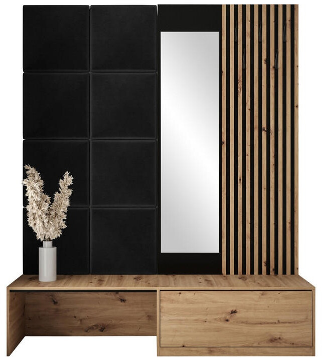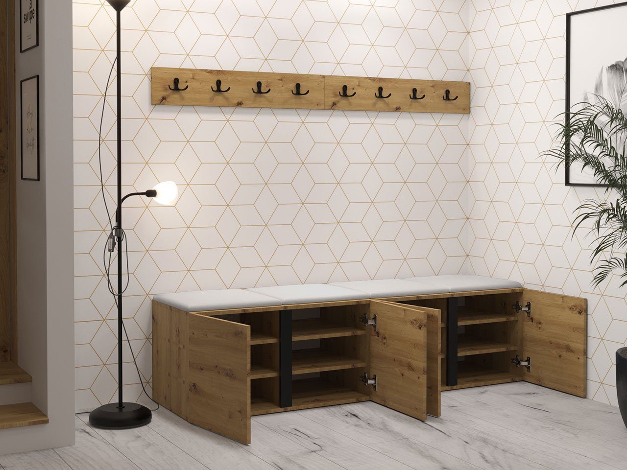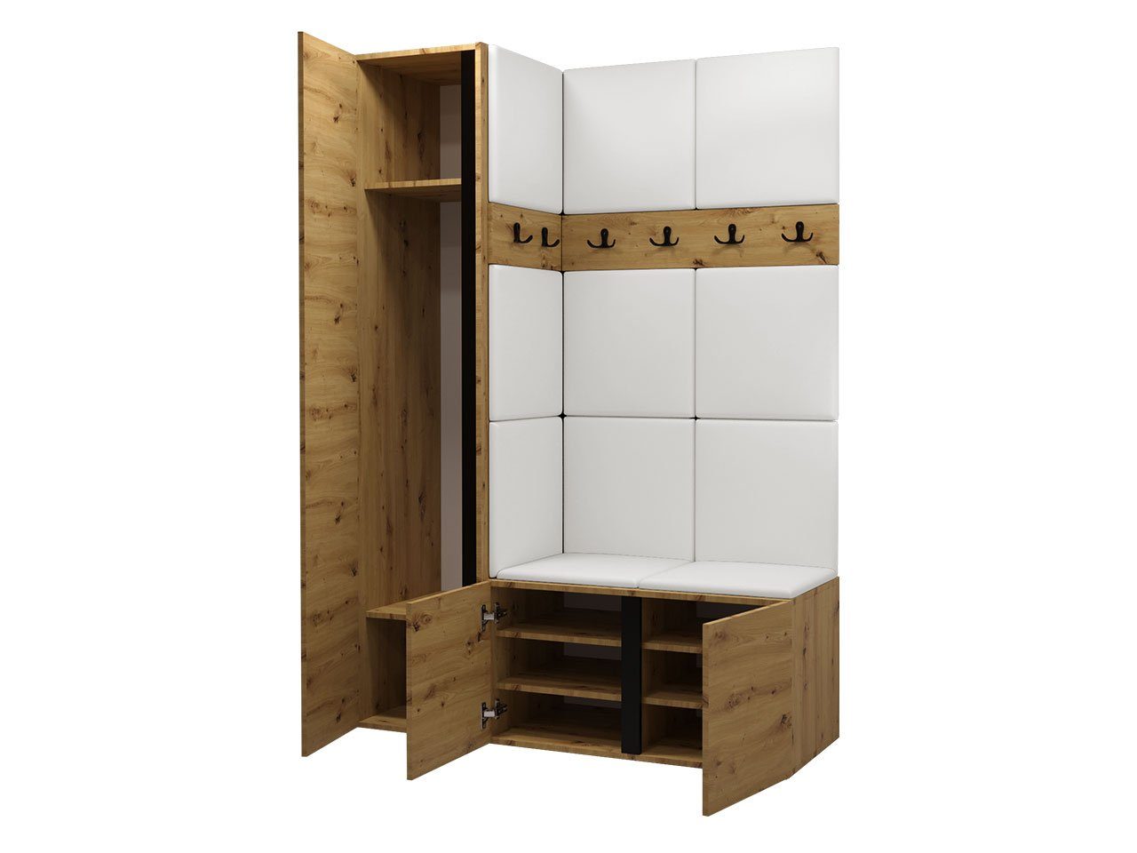 Endlich Ordnung im Flur! Dieses komplette Garderoben-Set Monati V hat alles was du brauchst: 4 Schuhschränke plus Kleiderhakenbrett plus gepolsterte Sitzbank - praktischer geht's kaum. Maße: 168 cm breit, 186 cm hoch, 45,6 cm tief - also Platz ohne Ende für Schuhe, Jacken und Taschen. In schicker Eiche Artisan/Schwarz Optik - sieht einfach klasse aus. Das Kleiderhakenbrett hat 8 Haken für Jacken, Taschen und Co. Die Sitzbank ist gepolstert und schützt gleichzeitig die Wand. Alles aus 16 mm Laminat mit PVC-Kanten - robust und langlebig. Wird in mehreren Paketen geliefert mit Aufbauanleitung, Montage-Service gibt's leider nicht. Aber der Aufbau ist machbar, versprochen! Perfekt für Familien, Paare oder alle die Ordnung lieben. Dein Flur wird vom Chaos-Zone zur Wohlfühl-Oase. Einrichtungs-Profi-Tipp: Passt super in meisten Flure und Eingangsbereiche!