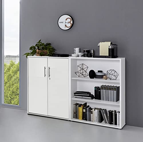 Die Monterrey Bürokombination Set 1 - Made in Germany! Enthält 2 hohe Aktenschränke (je 80x196x37 cm) mit abschließbaren Türen und 5 Fächern drin, plus ein hohes Aktenregal (50x196x37 cm) mit 5 Fächern. Alle mit stylischen Glasoberböden und Fronten. Sieht nicht nur super aus, sondern ist auch mega praktisch. Die Türen haben sanfte Dämpfung und die ABS-Kanten sorgen für Langlebigkeit. Perfekt fürs Homeoffice oder den Firmenbereich. Alles sicher verschließbar - ideal für wichtige Dokumente. Einfach aufbauen und sofort Ordnung schaffen. Die weiße Farbe passt zu jedem Einrichtungsstil. Lieferung ohne Deko - aber die brauchst du bei dem schicken Design eh nicht. Ca.-Maße bitte beachten. Einfach klasse für mehr Stauraum und Organisation im Büro!