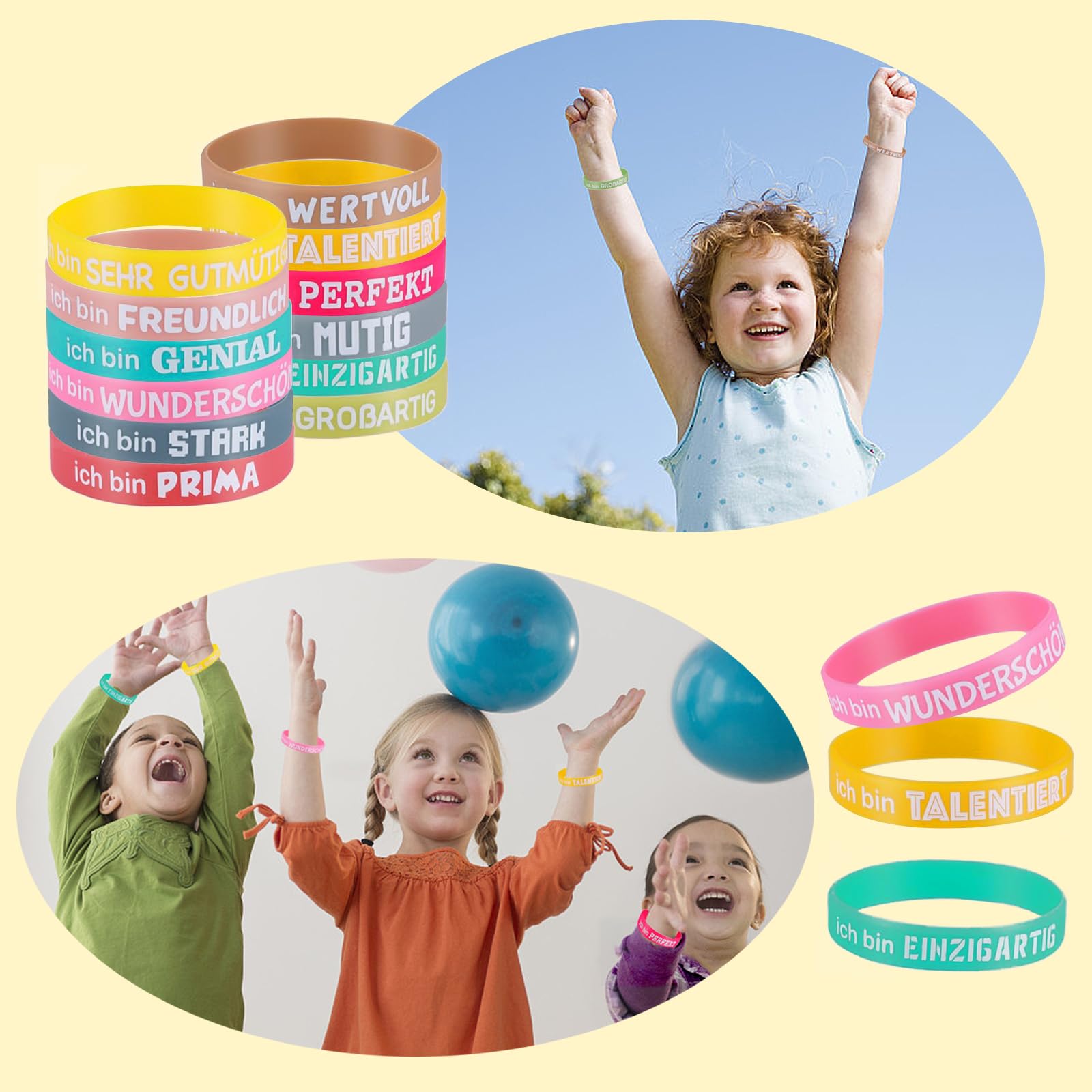 Brauchst du mal einen Motivationsschub? Diese 24 Silikonarmbänder mit positiven Sprüchen sind genau das Richtige! Im Set findest du 12 verschiedene deutsche Motivationssprüche - jeweils doppelt, damit du eines behalten und eines verschenken kannst. Die Armbänder sind aus weichem, hautverträglichem Silikon und passen sich jedem Handgelenk an. Super für Kinder in der Grundschule, Teenager, aber auch für Erwachsene im Büro oder beim Sport. Die inspirierenden Botschaften geben dir den extra Push, wenn mal nicht alles so läuft. Perfekt als kleines Geschenk für Freunde, Kollegen oder Teammitglieder. Egal ob als Belohnung für Sportveranstaltungen, bei Abschlussfeiern oder einfach als tägliche Erinnerung an deine Stärken - diese Armbänder verbreiten gute Laune und positive Energie. Einfach überstreifen und den Tag mit einem Lächeln angehen! So macht Motivation Spaß und sieht dabei auch noch stylisch aus.