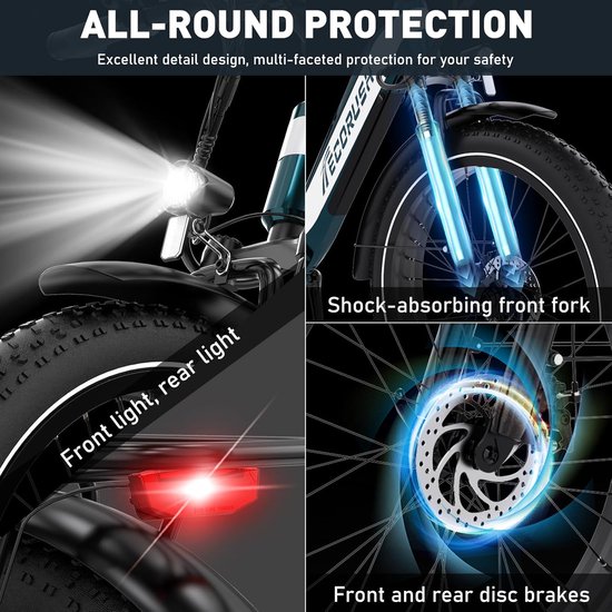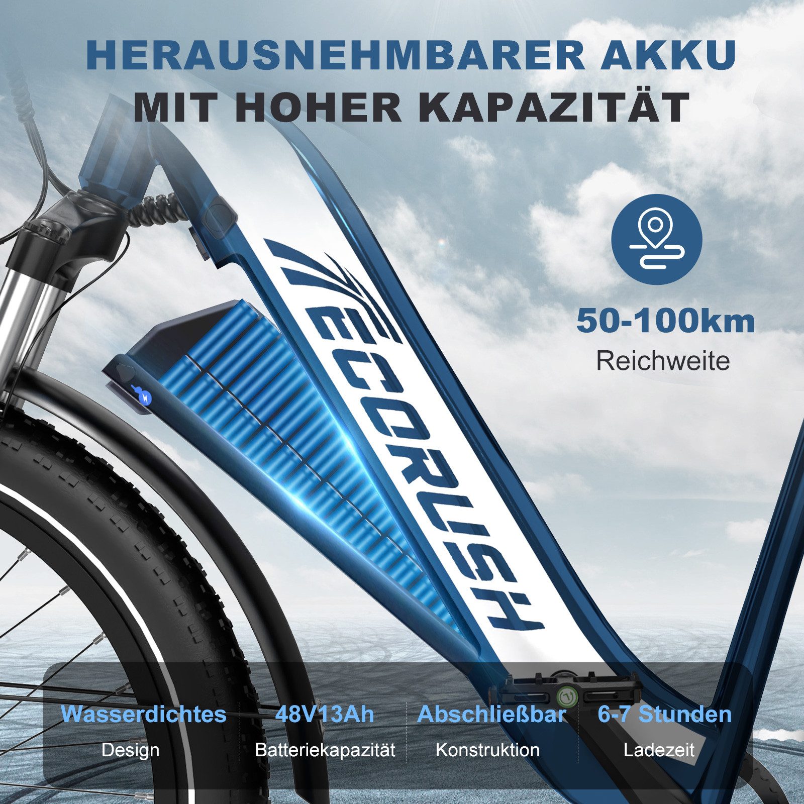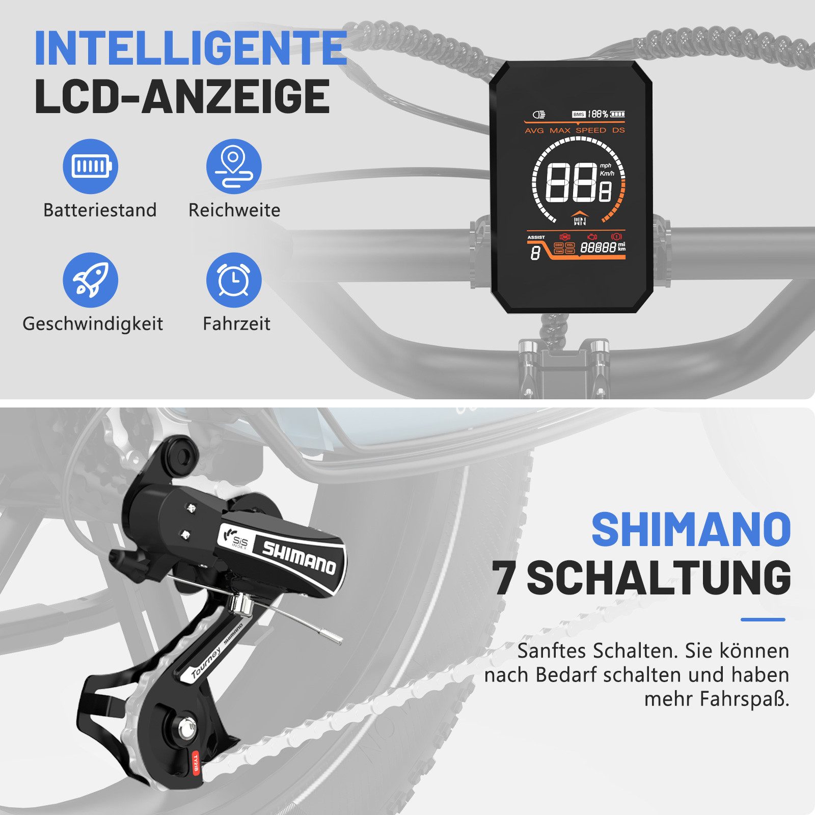 Das ECORUSH ECO R6 E-Bike ist ein absoluter Alleskönner! Mit seinen dicken 20×4,0 Zoll Reifen meisterst du jedes Gelände - ob Strand, Schnee oder unbefestigte Wege. Der 250W Motor bringt dich locker auf 25 km/h und der 48V/15,6Ah Lithium-Akku sorgt für genug Power für lange Touren. Das 7-Gang-Getriebe gibt dir die perfekte Kontrolle in jeder Situation. Die stoßdämpfende Vorderradgabel und verstellbare Stoßdämpfer machen selbst holprige Wege angenehm. Doppelscheibenbremsen vorne und hinten garantieren dir maximale Sicherheit. Das 3,5-Zoll LCD-Display zeigt dir alle wichtigen Daten auf einen Blick. Ob für den Stadtverkehr, Waldwege oder Bergtouren - dieses E-Bike ist immer die richtige Wahl. Erhältlich in trendigen Farben wie Dunkelgrau, Grün und Blau. Und das Beste: Es kommt zu 90% vormontiert - du musst es nur noch fertig zusammenbauen! Perfekt für Herren und Damen, die gerne mobil und umweltfreundlich unterwegs sind.