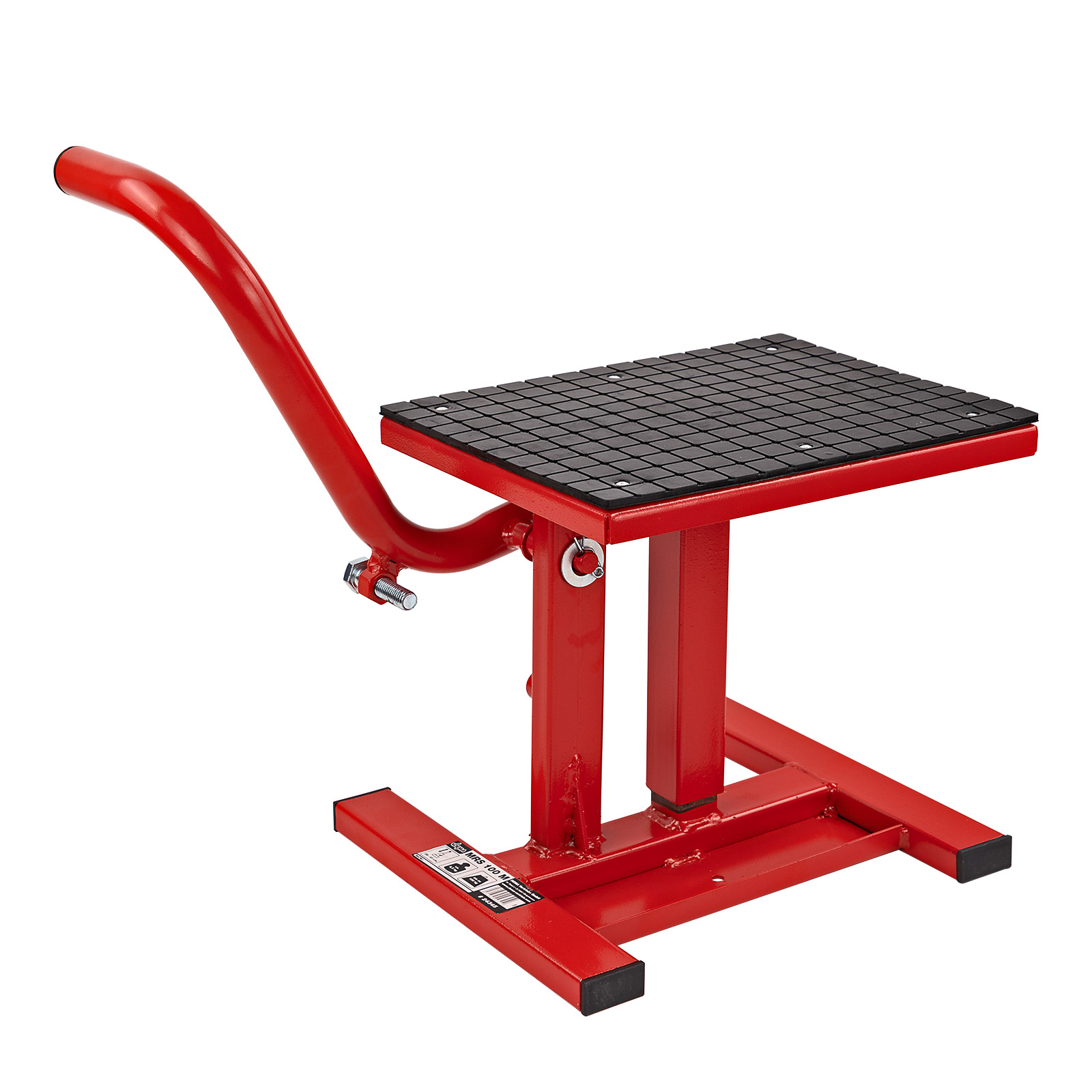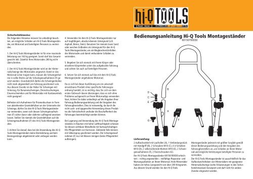 Boah, dieser Motorradständer von Hi-Q Tools ist einfach praktisch! Damit bockst du deine Enduro oder Crosser easy auf - ob in der Garage oder an der Strecke. Einfach mit dem Fuß anheben, schon steht dein Bike sicher. Hält bis zu 160 kg aus, also auch für schwerere Maschinen geeignet. Die Stahlplatte hat ne Gummimatte für guten Grip und da ist sogar n Ablagefach für Kleinteile integriert. Super für Kettenschmieren, Räderwechsel oder andere Werkstattarbeiten. Maße: Aufnahmeplatte 240x298 mm, Standfläche 338x257 mm. Cross-Version hat 300-386 mm Höhe. Achtung: Immer auf ebenem Untergrund verwenden und beim ersten Mal besser zu zweit arbeiten - Sicherheit geht vor!