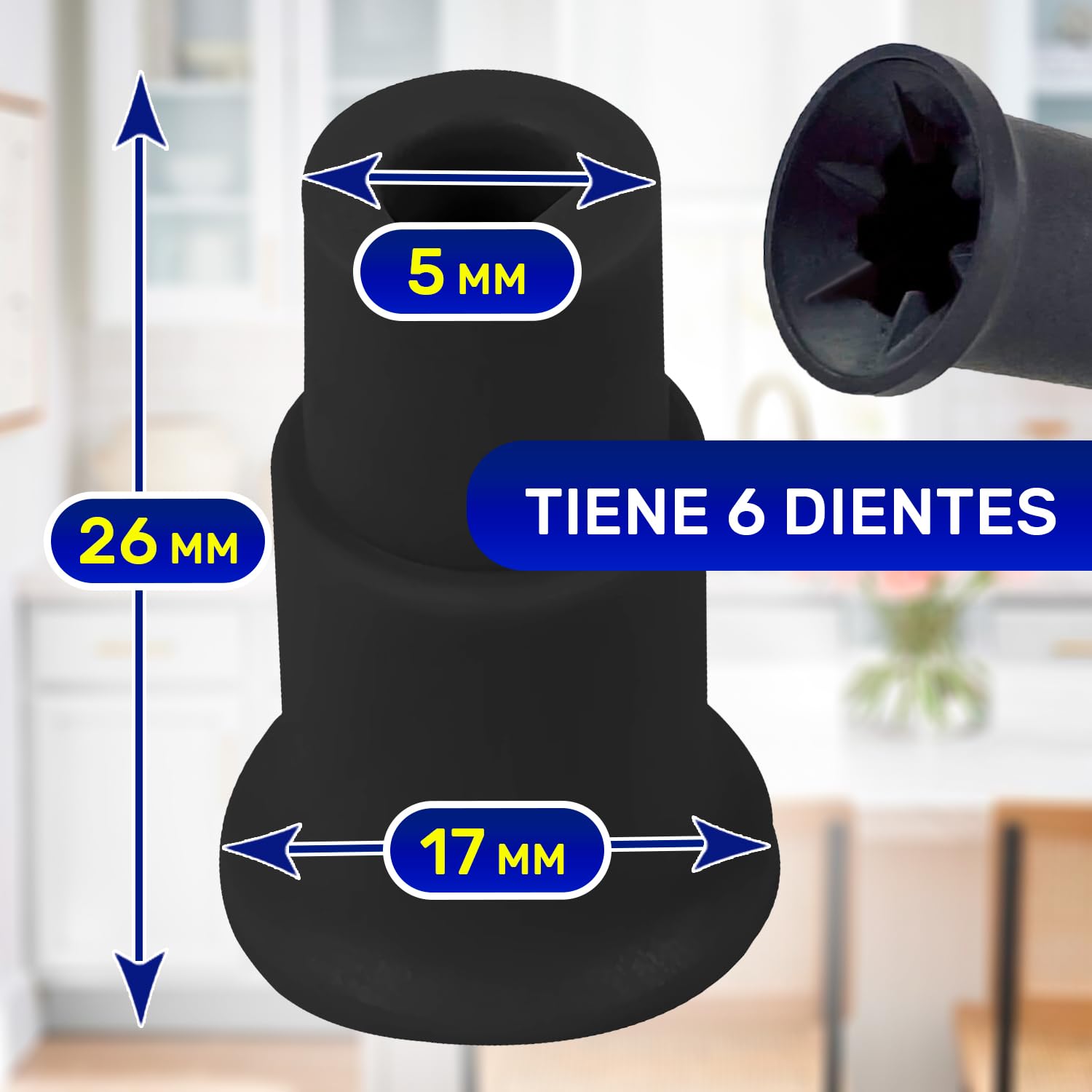 26mm lang, 17mm Durchmesser mit 5mm und 6 Zähnen - genau die richtigen Maße. Aus hochwertigem Kunststoff, hält auch thermischen Belastungen stand. Für 700W Geräte geeignet.