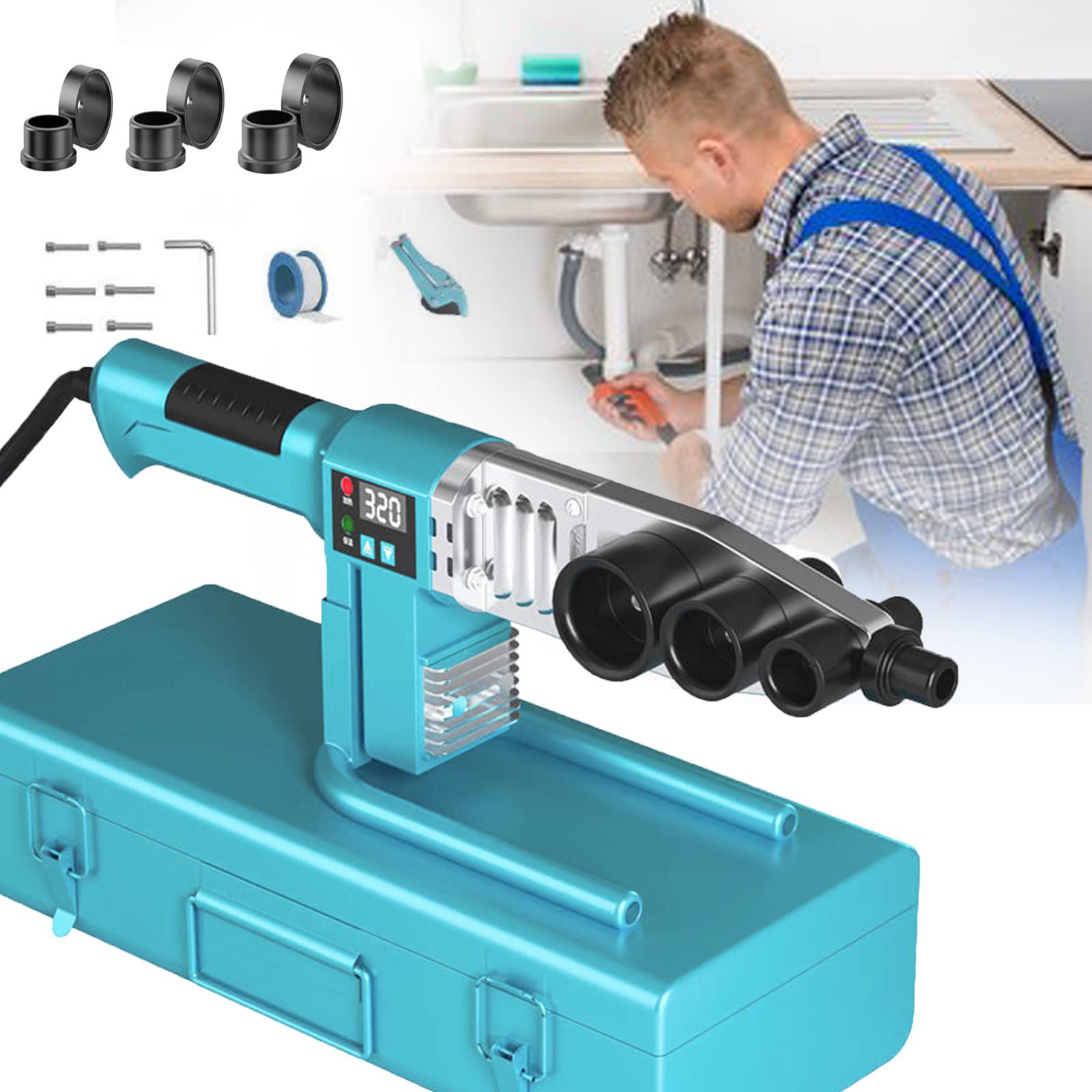 Professionelles Schweißen für Kunststoffrohre! Dieses 850W Muffenschweißgerät mit 6 Matrizen (20, 25, 32, 40, 50, 63mm) macht dich zum Installations-Profi. Temperatur von 0-380°C digital einstellbar - perfekt für PPR, PE, PP und PB Rohre. Mit verstellbarer Halterung für perfekte Schweißnähte. Alles sicher verpackt in der praktischen Werkzeugkiste. Einfach die richtige Matrize wählen, Temperatur einstellen und loslegen! Ideal für Heimwerker und Profis - für dichte Verbindungen in der Wasserinstallation.