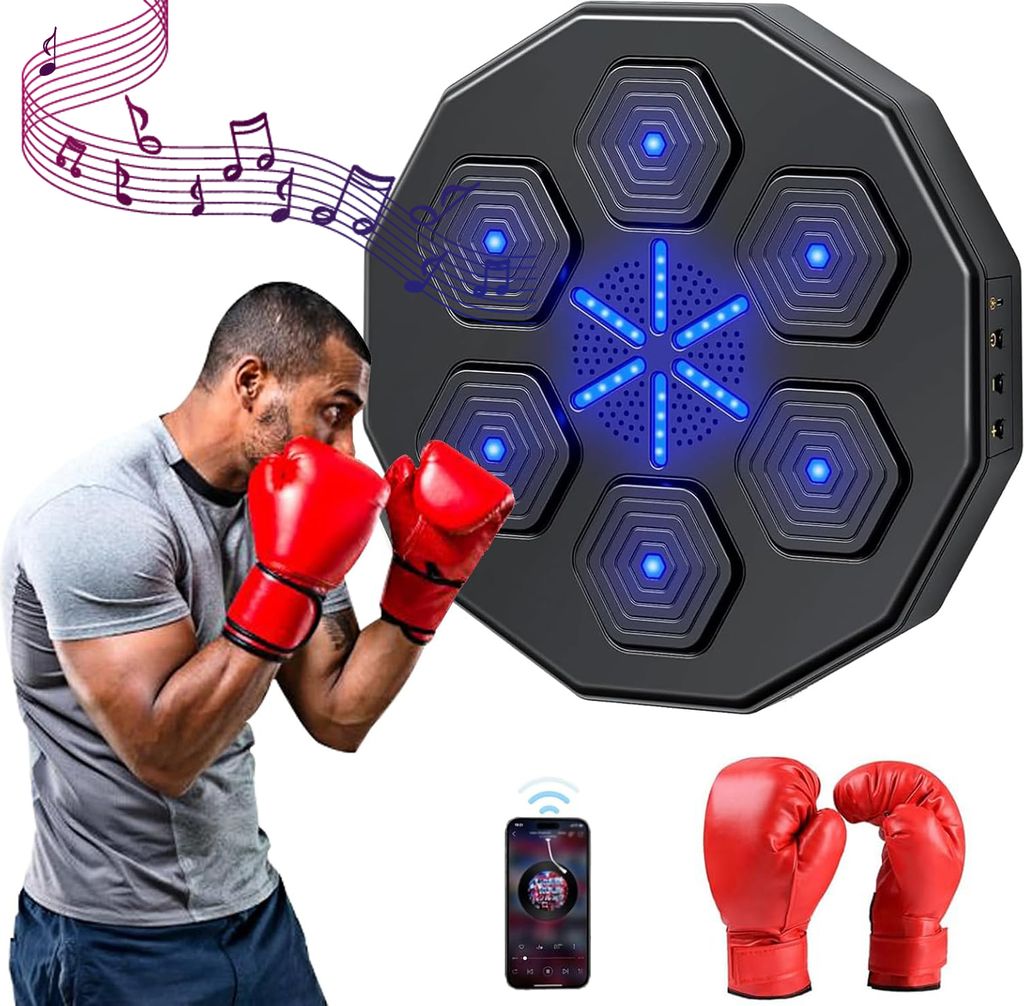 Ready for some boxing? Diese Music Boxing Machine bringt den Boxclub zu dir nach Hause! Mit Bluetooth-Lautsprecher für deine Lieblingsmusik und coolen LED-Lichtern im Takt. 9 verschiedene Modi und Geschwindigkeiten - für Anfänger und Profis. Einfach an der Wand montieren mit Klettband (kein Bohren nötig). 2000 mAh Akku hält 6 Stunden, lädt per USB-C. Perfekt für Stressabbau, Fitness und Koordination. Für Erwachsene und Kinder gleichermaßen geeignet. Macht einfach irre Spaß! Im Lieferumfang: Boxmaschine, Handschuhe, Klettband, Klebeband, Kabel. Das perfekte Geschenk für Fitness-Fans!