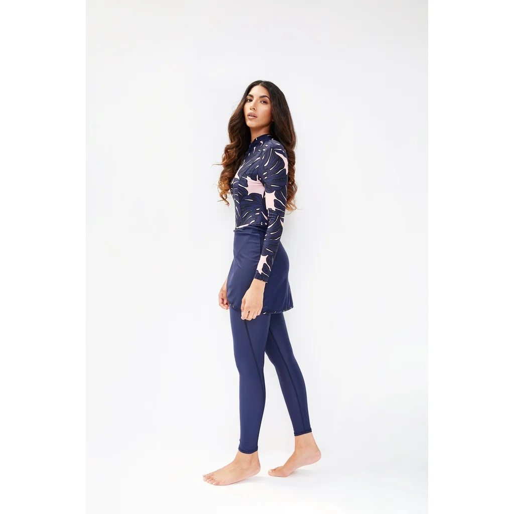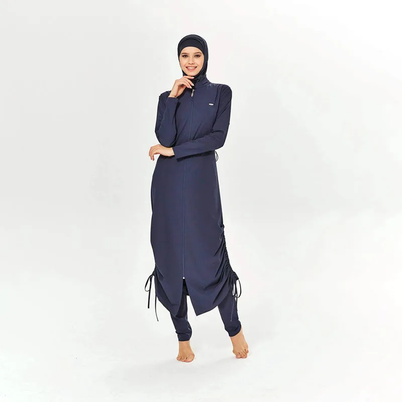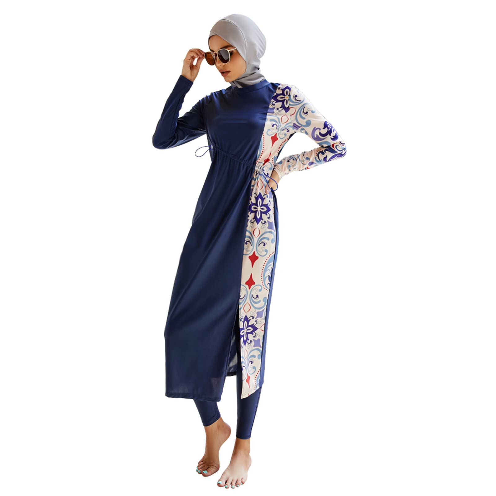 Baden mit Bedeckung, aber trotzdem voller Bewegungsfreiheit? Unser 3-teiliger muslimischer Badeanzug macht's möglich! Das Set besteht aus einem Oberteil, einer hochtaillierten Hose und einem passenden Hijab - alles perfekt aufeinander abgestimmt. Der Stoff ist schnell trocknend, atmungsaktiv und bietet UV-Schutz. So bist du am Strand oder im Schwimmbad optimal geschützt. Die Busteinsätze ohne Stahlbügel sorgen für maximalen Komfort, und die Hose sitzt sicher, auch beim Schwimmen. Egal ob beim Plantschen mit den Kids, Schwimmen oder Wassersport - dieser Burkini gibt dir die Freiheit, die du brauchst. Das Design ist modisch und deckt dabei diskret ab. Ein tolles Geschenk für dich selbst oder deine Liebsten - für unbeschwerte Stunden im Wasser!