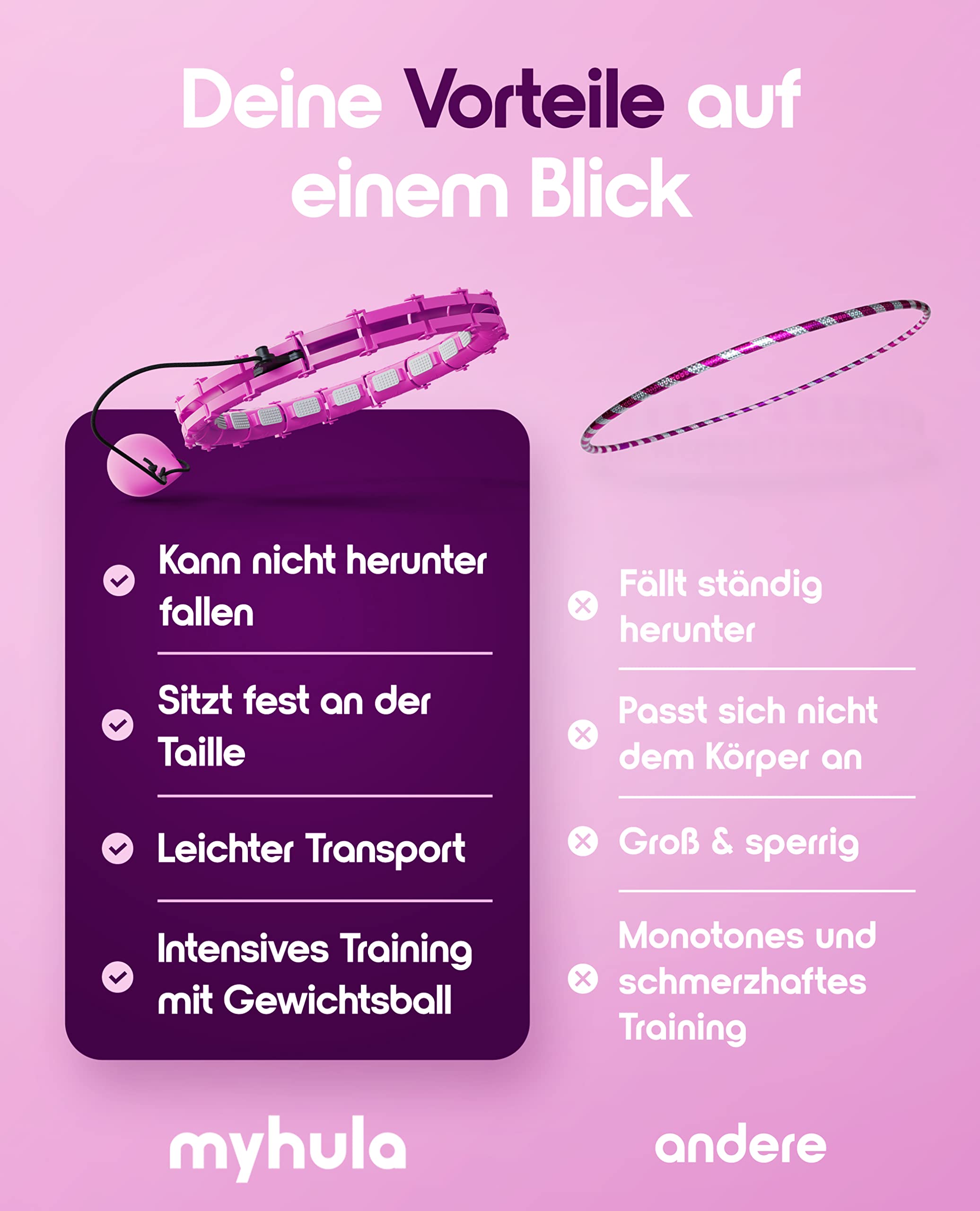 Abnehmen war noch nie so spaßig! Dieser myhula Smart Hula Hoop mit 24 verstellbaren Gliedern passt sich perfekt deiner Taille an. Mit Massagenoppen für eine tiefe Gewebemassage während des Trainings. Fördert die Blutzirkulation, verbrennt Kalorien und strafft die Muskulatur. Aus hochwertigem ABS-Material - leicht und langlebig. Die Anti-Rutsch Pads sorgen für angenehme Lautstärke. Perfekt für zu Hause - zusammenbauen und sofort loslegen. Trainiert Bauch, Rücken, Gesäß und Beine. In schicker Box - ideal als Geschenk. Dein persönlicher Fitness-Buddy für eine schlankere Taille und mehr Wohlbefinden!