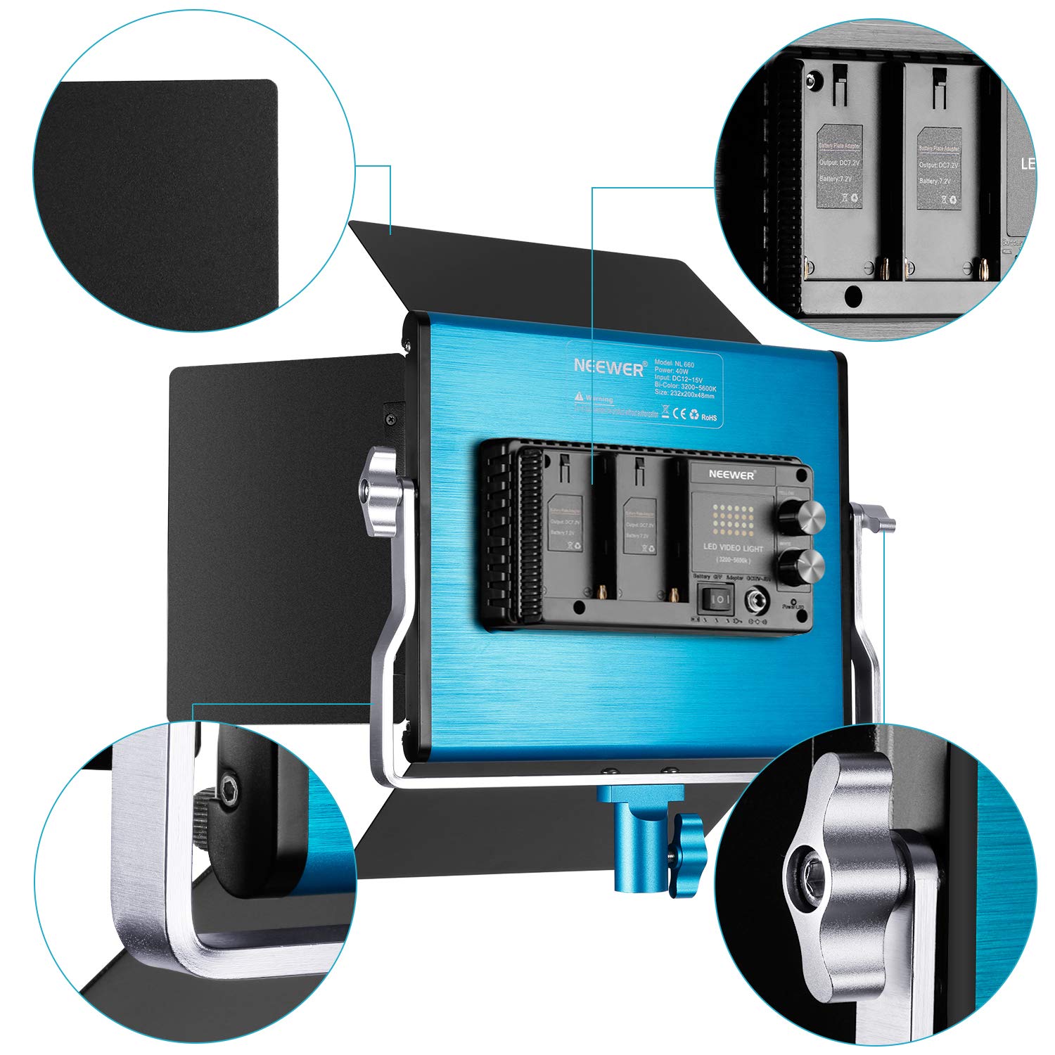 Das mitgelieferte Stativ ist bis zu 200cm ausziehbar und die U-förmige Halterung ermöglicht 360° Drehung - so positionierst du das Licht genau da, wo du es brauchst. Die vier abnehmbaren Barndoors helfen dir, das Licht gezielt zu lenken.