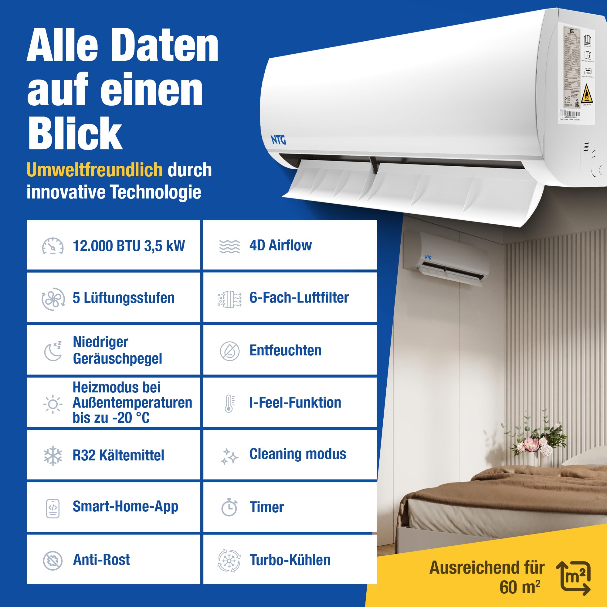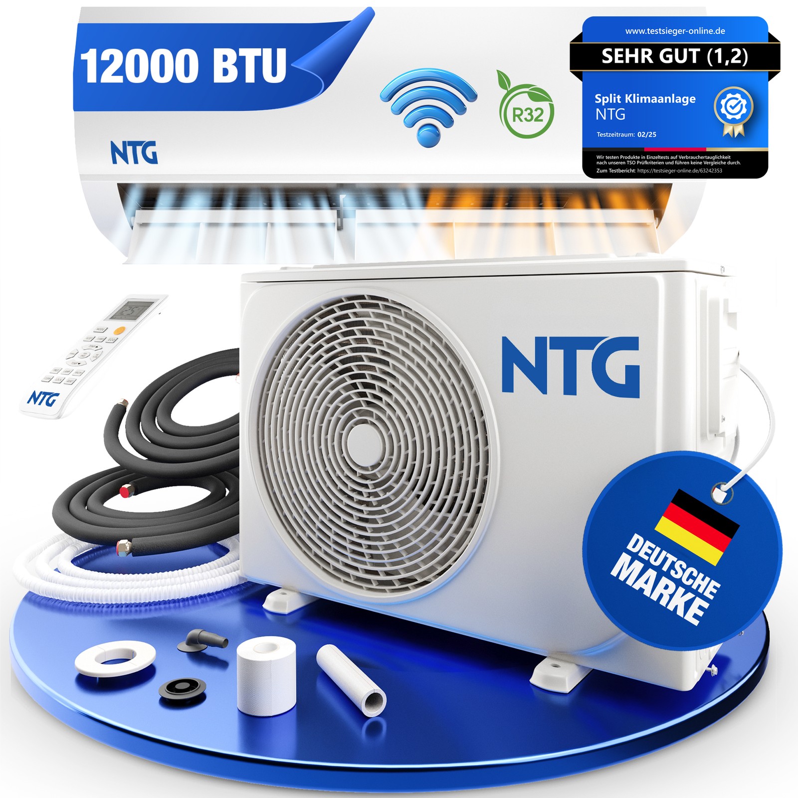 Perfektes Klima das ganze Jahr über! Diese NTG Split-Klimaanlage mit 12000 BTU (3,5 kW Kühlleistung) macht jeden Raum zur Wohlfühloase. Im Sommer kühlt sie zuverlässig runter, im Winter heizt sie mit 2,7 kW angenehm auf - so sparst du dir separate Heizgeräte. Besonders praktisch: Du kannst sie bequem per WLAN-App von unterwegs steuern oder mit der beiliegenden Fernbedienung bedienen. Ob du nach Hause kommst und es schon angenehm temperiert sein soll oder mal vergessen hast sie auszuschalten - mit der App hast du immer die Kontrolle. Der flüsterleise Betrieb mit nur 25-50 dB(A) stört nicht beim Schlafen oder Arbeiten. Das umweltschonende R32-Kältemittel erfüllt alle aktuellen Umweltstandards. Das Komplettset enthält alles für die Installation: Innen- und Außengerät, 3 Meter vorgefüllte Kältemittelleitung, Wandhalterung für innen und alle notwendigen Anschlüsse. Wichtig: Die Installation muss von einem zertifizierten Fachbetrieb durchgeführt werden - das ist gesetzlich vorgeschrieben und erhält die Garantie. Perfekt für Wohnzimmer, Schlafzimmer oder Homeoffice - hol dir jetzt deine persönliche Klimaanlage!