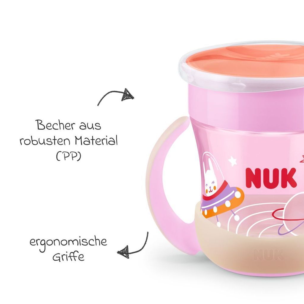 Perfekte Trinklern-Hilfe für dein Baby! Das NUK Mini Magic Cup Set enthält 2 niedliche Trinklernbecher mit Hasenmotiv, die im Dunkeln leuchten - wie magisch! Jeder Becher fasst 160ml und ist komplett BPA-frei. Das auslaufsichere System verhindert lästiges Verschütten, während die weichen Trinktüllen sanft zur empfindlichen Babyhaut sind. Inklusive Ersatzdeckel und -tüllen für langanhaltende Nutzung. Die ergonomische Form liegt gut in kleinen Händen und fördert spielerisch das selbstständige Trinken. Spülmaschinenfest für einfache Reinigung. Ideal für den Übergang von Flasche zu normalem Becher. Ob zu Hause oder unterwegs - mit diesen bunten Bechern macht Trinken lernen richtig Spaß! Vertraue auf NUK-Qualität, die Generationen von Eltern schätzen. Mach deinem Kleinen eine Freude und unterstütze seine Entwicklung mit diesen praktischen Lernbechern!
