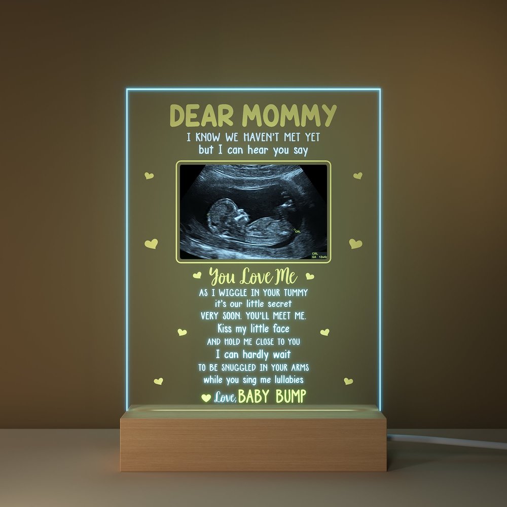 Was für eine süße Idee! Dieses personalisierte Nachtlicht mit deinem Ultraschall-Foto macht jede Babyzimmer-Ecke gemütlich. 20cm lang, 3cm hoch - dezent aber wirkungsvoll. Aus Acryl und Holz - hochwertig und langlebig. Warm-weißes LED-Licht mit einstellbarer Helligkeit - perfekt für nächtliche Fütterungen. USB-Betrieb - einfach anzuschließen. Einfach dein Ultraschall-Foto einsetzen - schon hast du ein einzigartiges Erinnerungsstück. Perfekt als Geschenk zur Babyparty, zur Geschlechts-Enthüllung oder einfach so für werdende Eltern. Schafft eine beruhigende Atmosphäre im Kinderzimmer. Auch nach der Geburt eine schöne Erinnerung an die aufregende Zeit. Kompakt, einfach zu installieren - mehr Aufwand nicht. Mach dein Zuhause noch gemütlicher mit dieser persönlichen Note. Ein Geschenk, das garantiert Freude bringt!