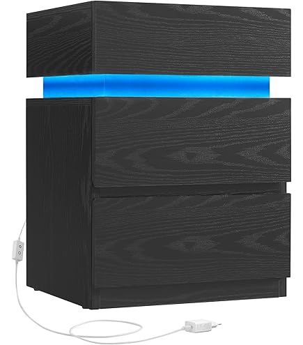 Moderne Nachttische mit allem Drum und Dran! Dieses 2er-Set in Schwarz hat integrierte Steckdosen (2x AC, 2x USB) - perfekt zum Handy laden. Mit coolen LED-Lichtern in 16 Farben, steuerbar per Fernbedienung. Jeder Nachttisch ist 40x35x65cm groß mit 2 Schubladen und offenem Stauraum. Aus hochwertiger Spanplatte - stabil und langlebig. Die Schubladen laufen super smooth auf 3-fach Schienen. In 30 Minuten aufgebaut und schon hast du stylische Nachttische mit praktischen Features!