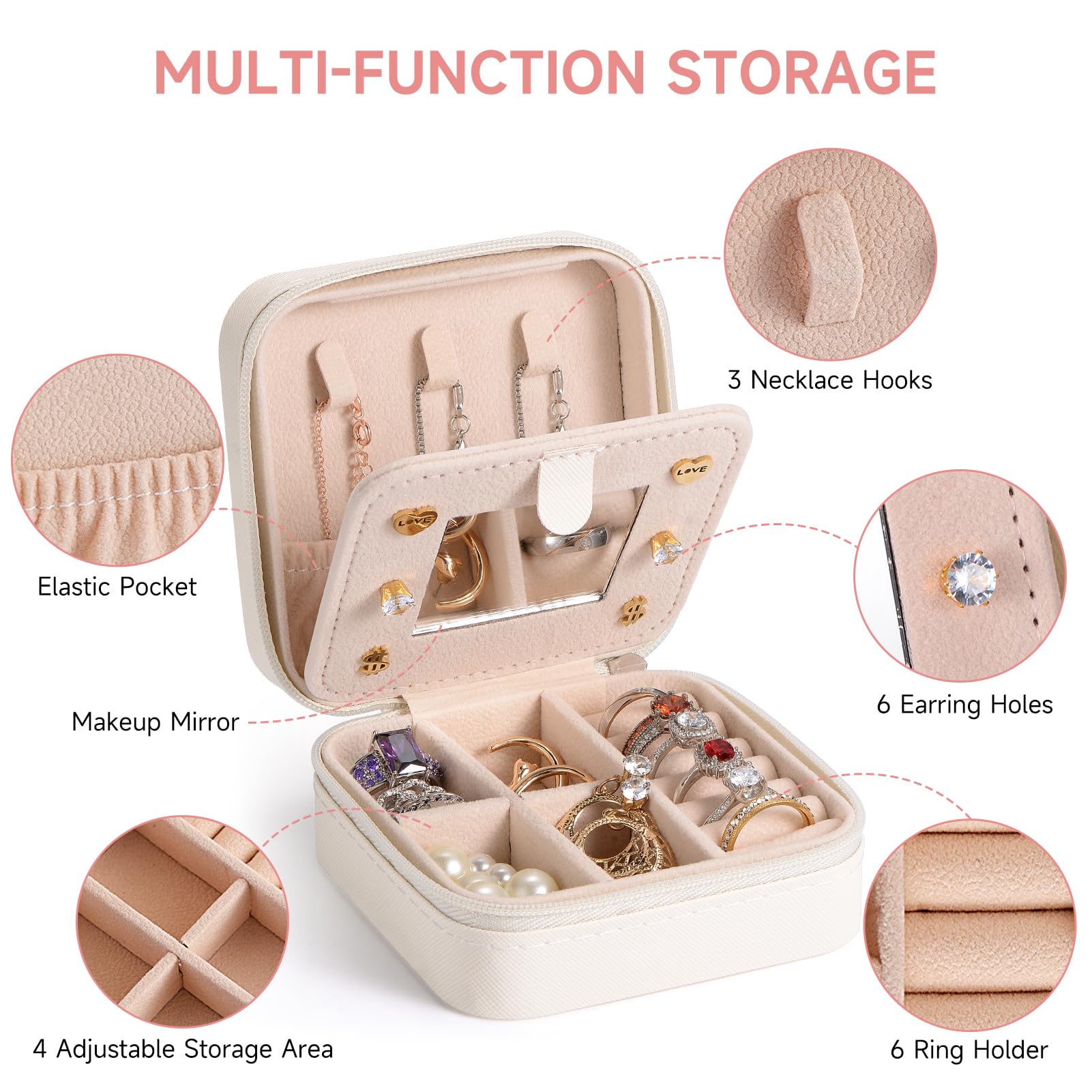 • 7 Ringfächer + 4 herausnehmbare Fächer + 6 Ohrringhalter
