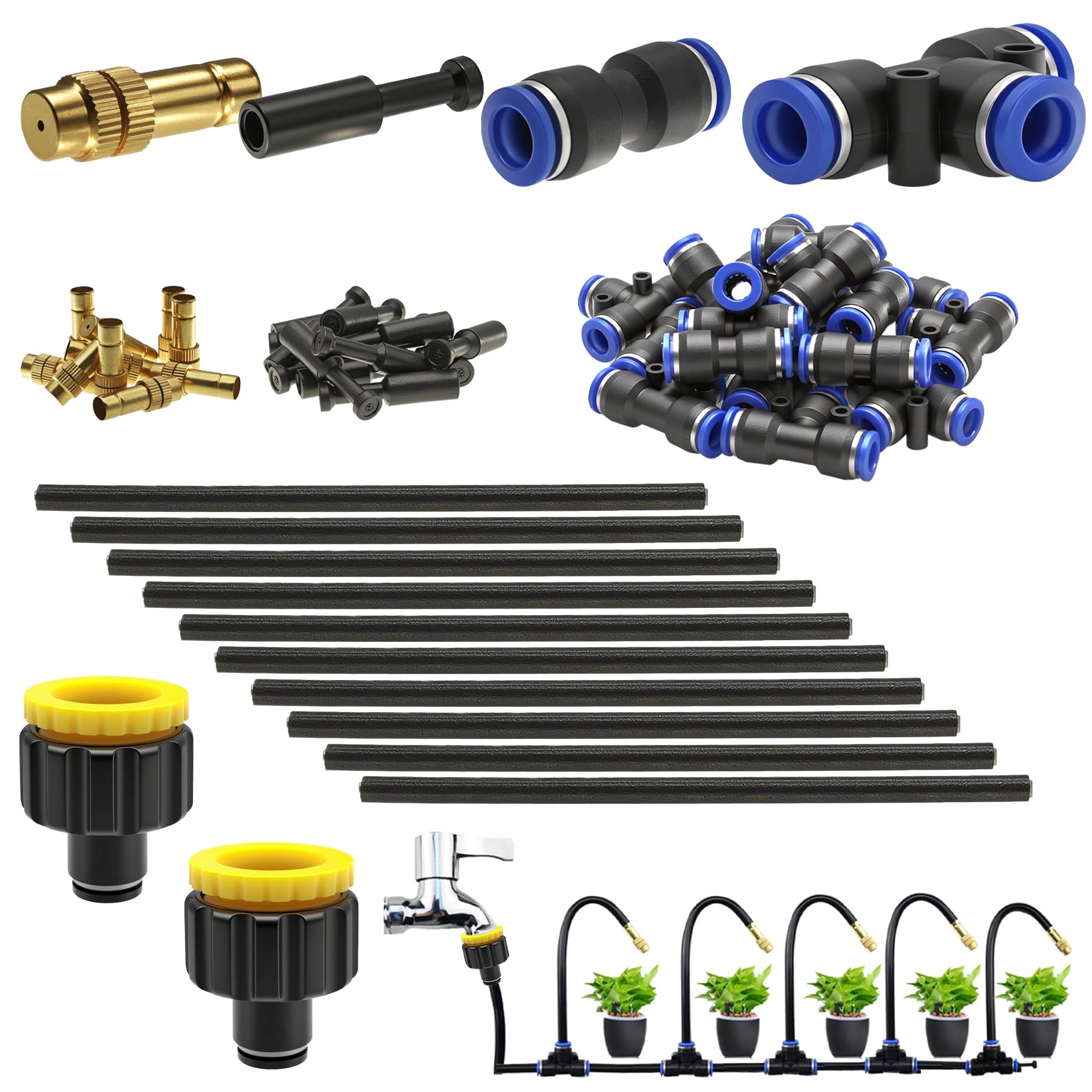 Hey du Hobby-Gärtner! Dieses CESFONJER Messing Nebeldüsen Set ist genau das Richtige für eine professionelle Bewässerung in deinem Garten. Mit den 10 Messingdüsen (1,1 mm Öffnung) kannst du zwischen Sprühen, Tropfen und nicht verschließbar wählen - total flexibel! Die Düsen sind korrosionsbeständig und halten echt lange. \\n\\nDas coole an dem Set: Alles ist für 8 mm Schläuche ausgelegt (die sind aber nicht im Lieferumfang enthalten). Mit den 10 I- und 10 T-Schnellverbindern baust du dir im Handumdrehen dein individuelles Bewässerungssystem auf. Die 20 cm langen Richtungsstangen lassen sich beliebig biegen und behalten ihre Form - so triffst du genau die Stellen, die bewässert werden müssen. \\n\\nIm Set findest du: \\n- 10x Messingdüsen \\n- 10x I-Schnellverbinder \\n- 10x T-Schnellverbinder \\n- 12x Durchflussblockierköpfe \\n- 10x Richtungsstangen \\n- 2x Wasserhahnadapter (1/2 und 3/4 Zoll) \\n\\nDie Installation ist kinderleicht - einfach zusammenstecken, ohne Werkzeug! Die Verbinder sind druckfest und stolpersicher. Egal ob für deinen Rasen, das Gewächshaus oder die Terrasse - mit diesem System machst du nichts verkehrt. Der Wasserdruck lässt sich stufenlos einstellen und der Sprühwinkel von 1-90 Grad gibt dir volle Kontrolle. \\n\\nAlso, wenn du deine Pflanzen optimal versorgen willst, ohne ständig mit der Gießkanne rennen zu müssen, ist dieses Set perfekt für dich. Einfach aufbauen und den Garten genießen!
