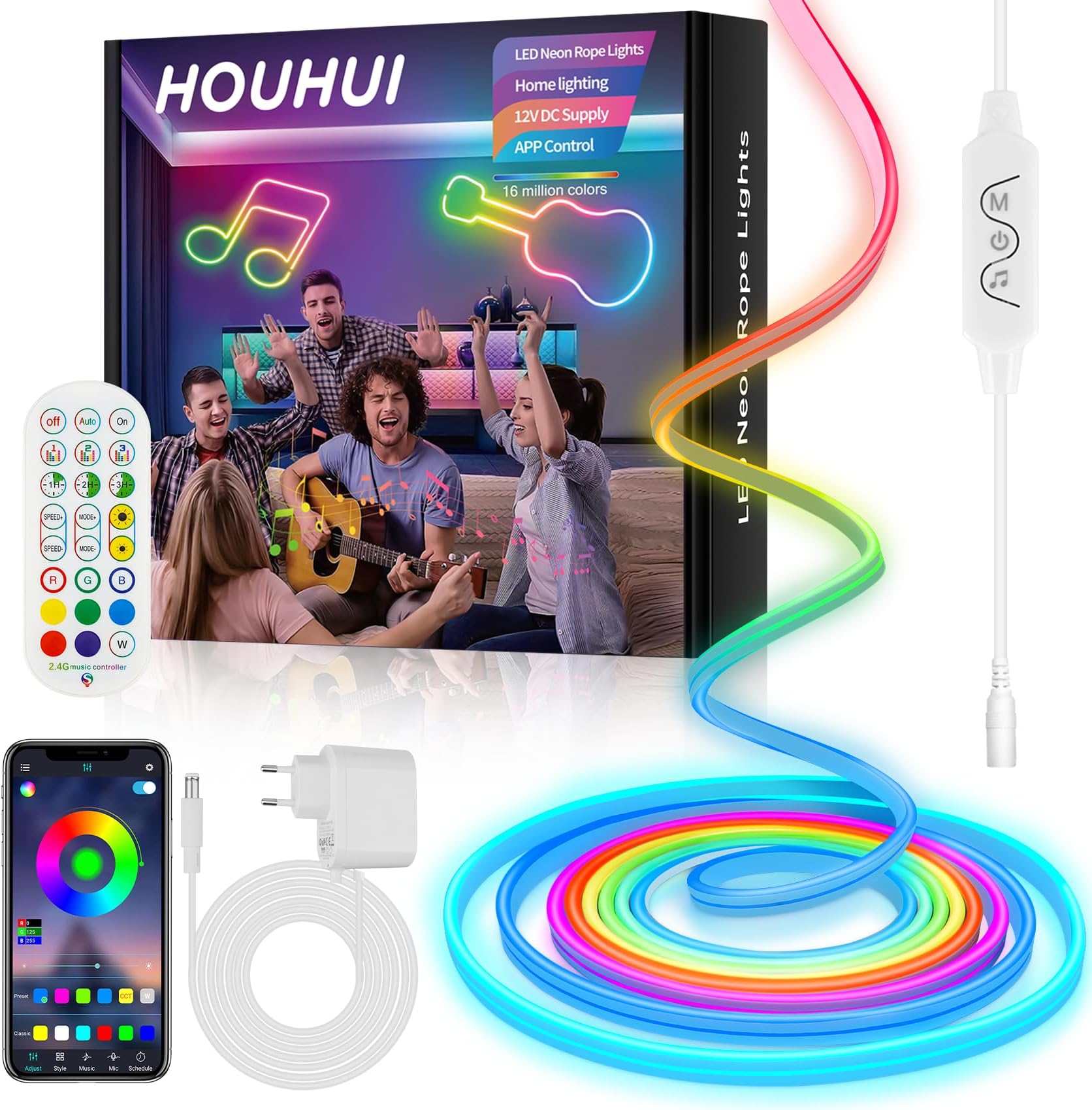 Zack, und dein Zimmer verwandelt sich in eine coole Lichtshow! Dieser 5 Meter lange RGB IC Neon Streifen ist der absolute Game-Changer fĂŒr dein Zuhause. Mit der Smart App steuerst du Millionen von Farben und Effekten - alles von deinem Handy aus! đ±\n\nDas Besondere: Jedes Segment kann einzeln angesteuert werden! Du willst links Blau und rechts Rot? Kein Problem! Der Musik-Modus lĂ€sst die Lichter im Takt deiner Lieblingssongs tanzen - perfekt fĂŒr Partys!\n\nIP65 wasserdicht bedeutet: Drinnen und drauĂen einsetzbar! Ob hinterm Fernseher, unter dem Bett, im Gaming-Bereich oder auf dem Balkon - dieser Streifen macht ĂŒberall eine gute Figur.\n\nDer Silikonschlauch ist superflexibel und lĂ€sst sich um jede Ecke biegen. Mit den mitgelieferten Clips montierst du ihn sicher und einfach ĂŒberall dort, wo du ihn haben willst.\n\nSuper fĂŒr: âą Gaming-Setups âą Wohnzimmer-Ambiente âą Schlafzimmer-Stimmung âą Party-Beleuchtung âą AuĂenbereich\n\nLieferumfang: 5m LED-Streifen, Montage-Clips, Netzteil - alles dabei! Einfach App runterladen und die Licht-Party kann beginnen!