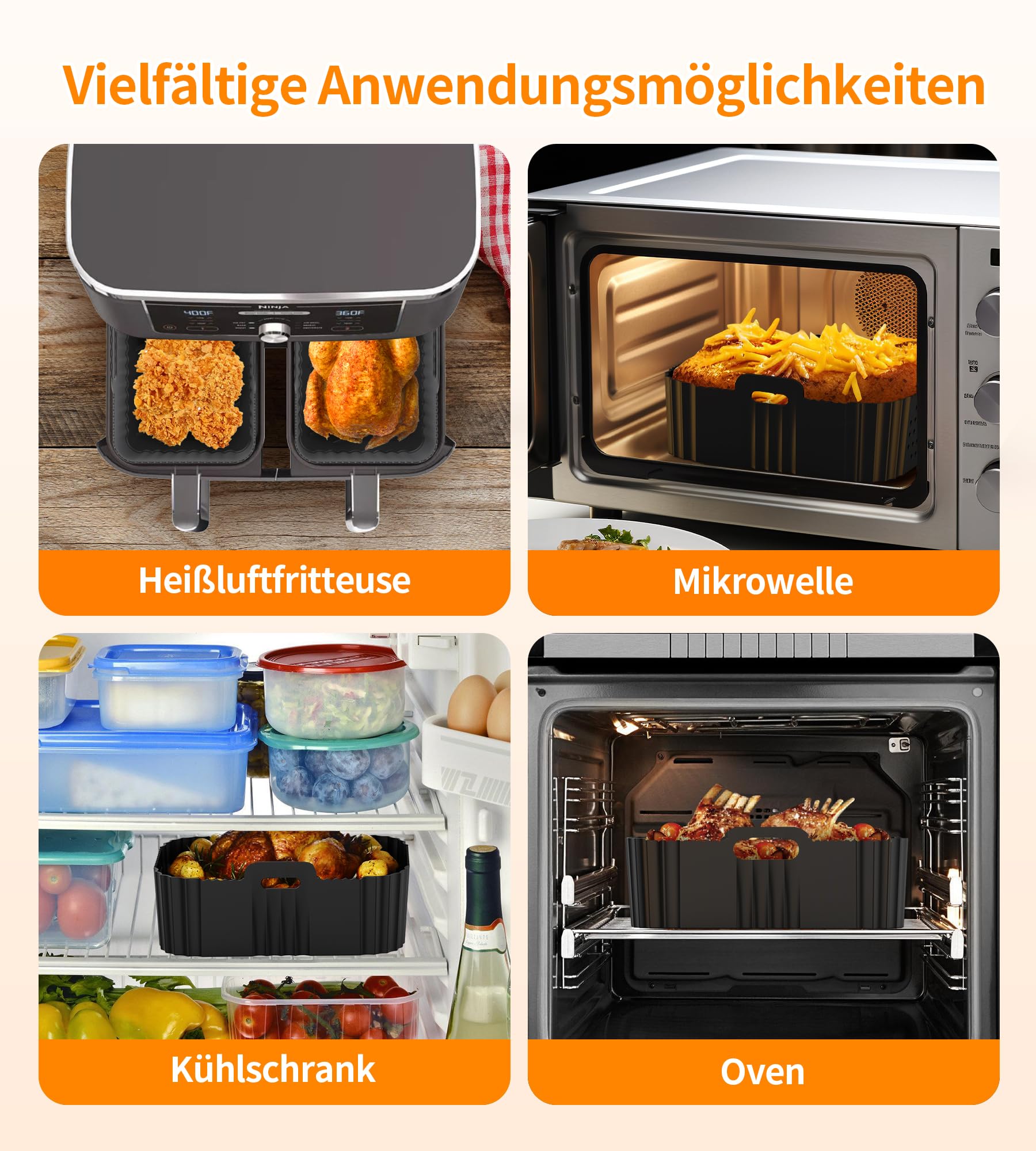 Hey, wenn du eine Ninja Foodi Heißluftfritteuse hast (SL400EU, AF400EU, AF300EU oder ähnliche Modelle mit 7,6-9,5L Fassungsvermögen), dann ist dieses 14-teilige Zubehör-Set genau das Richtige für dich! Die Silikonformen haben die perfekte Größe (19x14x7cm) und dieses cleveres Loch-Design auf beiden Seiten - da zirkuliert die heiße Luft super und alles wird gleichmäßig knusprig. Aus lebensmittelechtem Silikon, BPA-frei und hitzebeständig von -51°C bis 240°C. Die Griffe auf beiden Seiten sind praktisch, damit du dich nicht verbrennst. Reinigen? Super einfach - mit warmem Seifenwasser oder in der Spülmaschine. Du kannst die Teile nicht nur in der Fritteuse, sondern auch im Ofen, Mikrowelle oder Dampfgarer verwenden. Echt vielseitig! Bevor du bestellst, miss lieber kurz nach, ob's in deine Fritteuse passt - solange der Innenraum größer ist als die Form, klappt's. Macht das Kochen noch einfacher und vielfältiger!